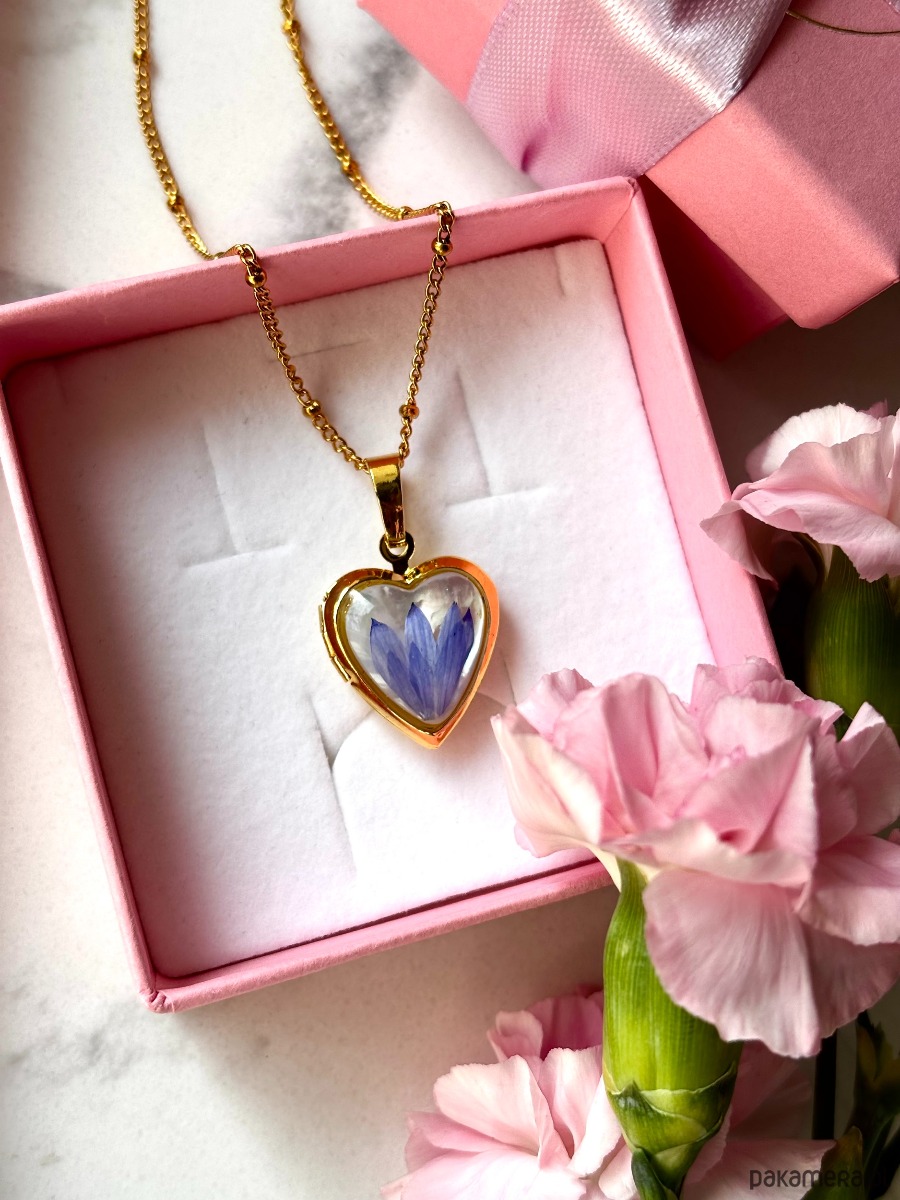 Materiał: stal nierdzewna w kolorze złotym, żywica epoksydowa, suszone kwiaty, masa perłowa.