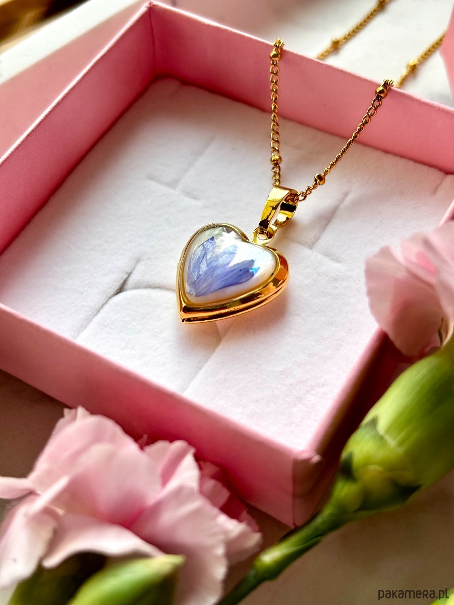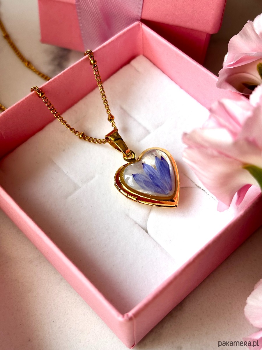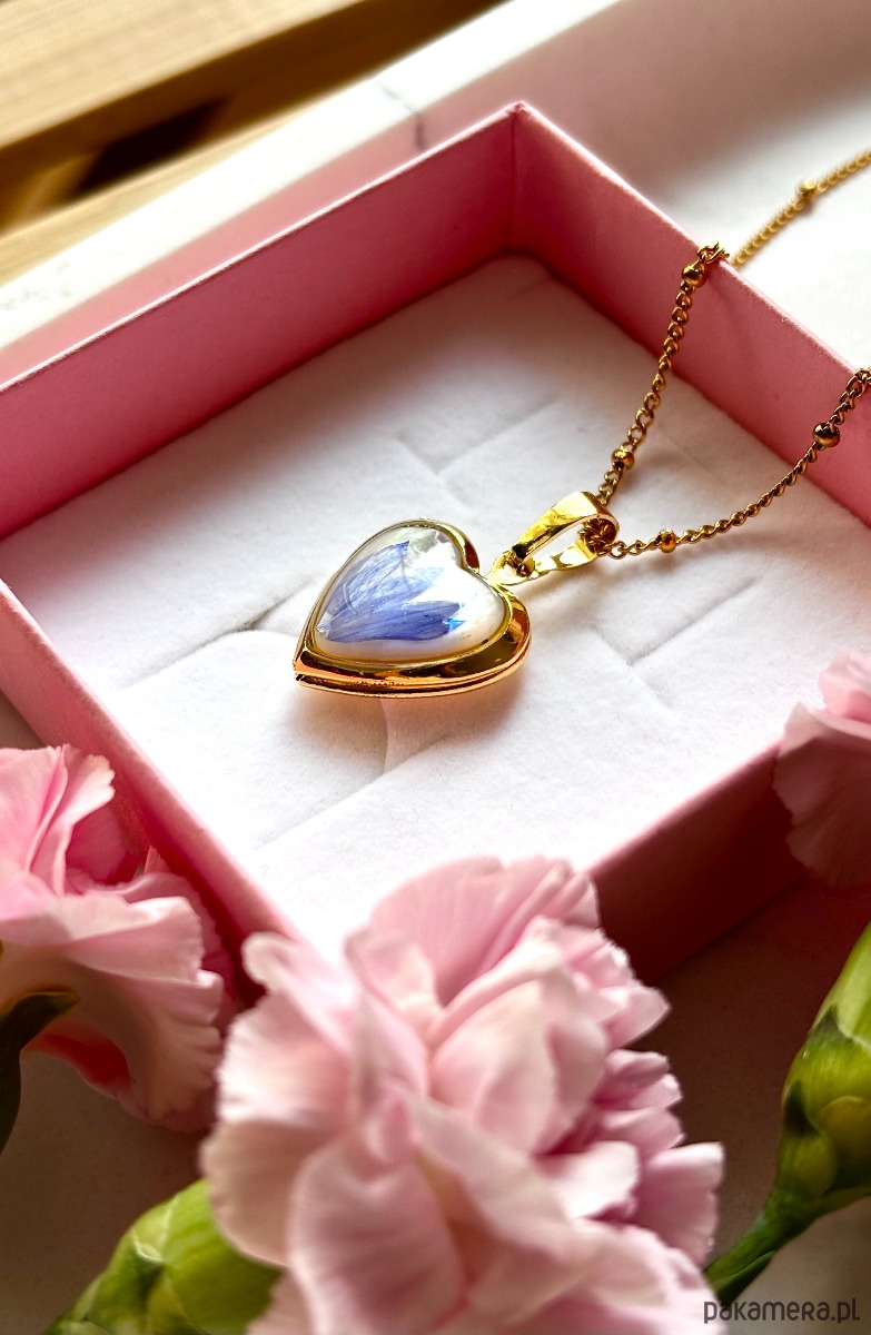 Sekretnik w kształcie serca, wykonany z kwiatów chabra na tle z masy perłowej.