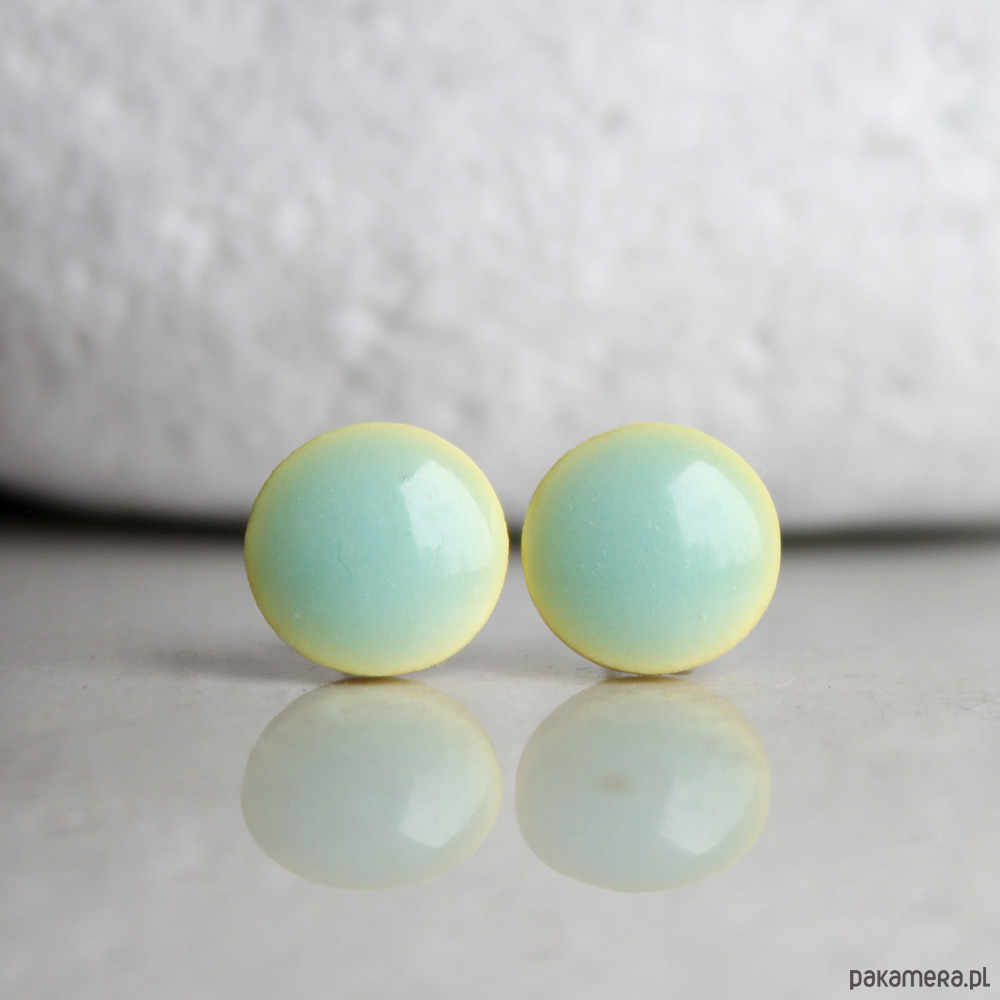 Ceramiczne okrągłe kolczyki w formie sztyftów, ręcznie wykonane z barwionej na jasnożółto porcelany, jednostronnie szkliwione mieszanką bladozielonego szkliwa, na antyalergicznych sztyftach w kolorze srebrnym. Średnica ok. 9mm. Polecam