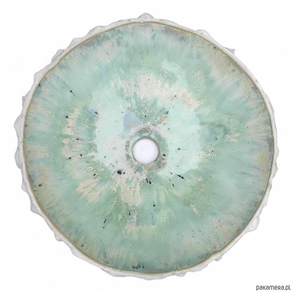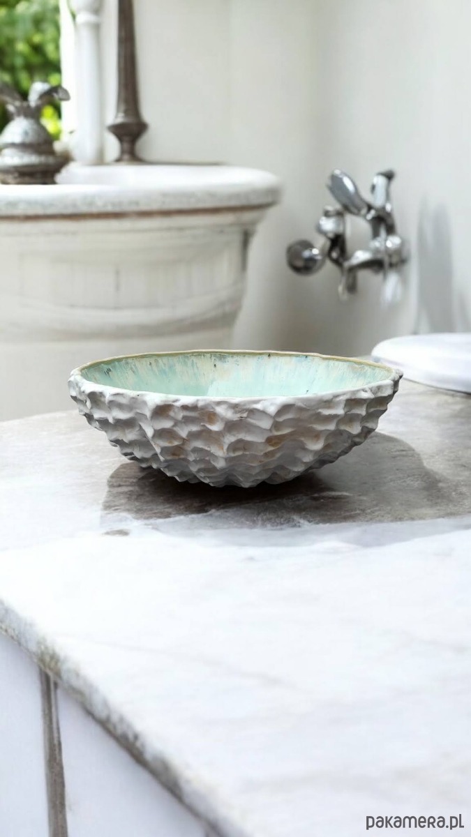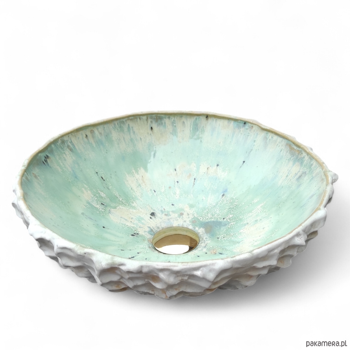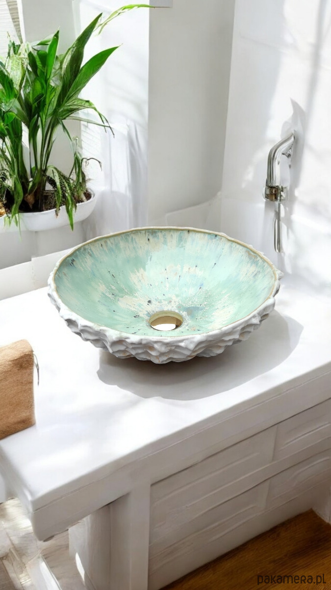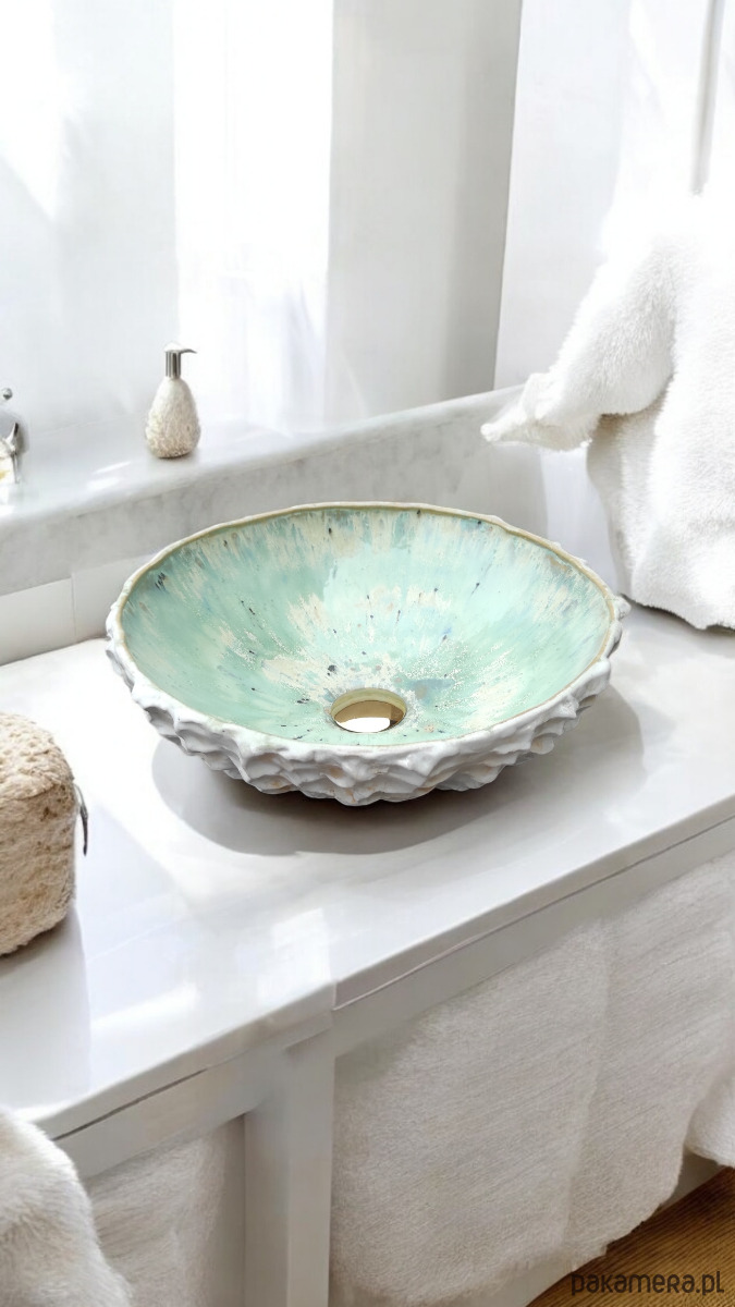 Niezwykle oryginalna umywalka nablatowa. Na zewnątrz matowa w ciepłym odcieniu bieli, w środku seledynowa z drobnymi beżowymi "kryształami"
