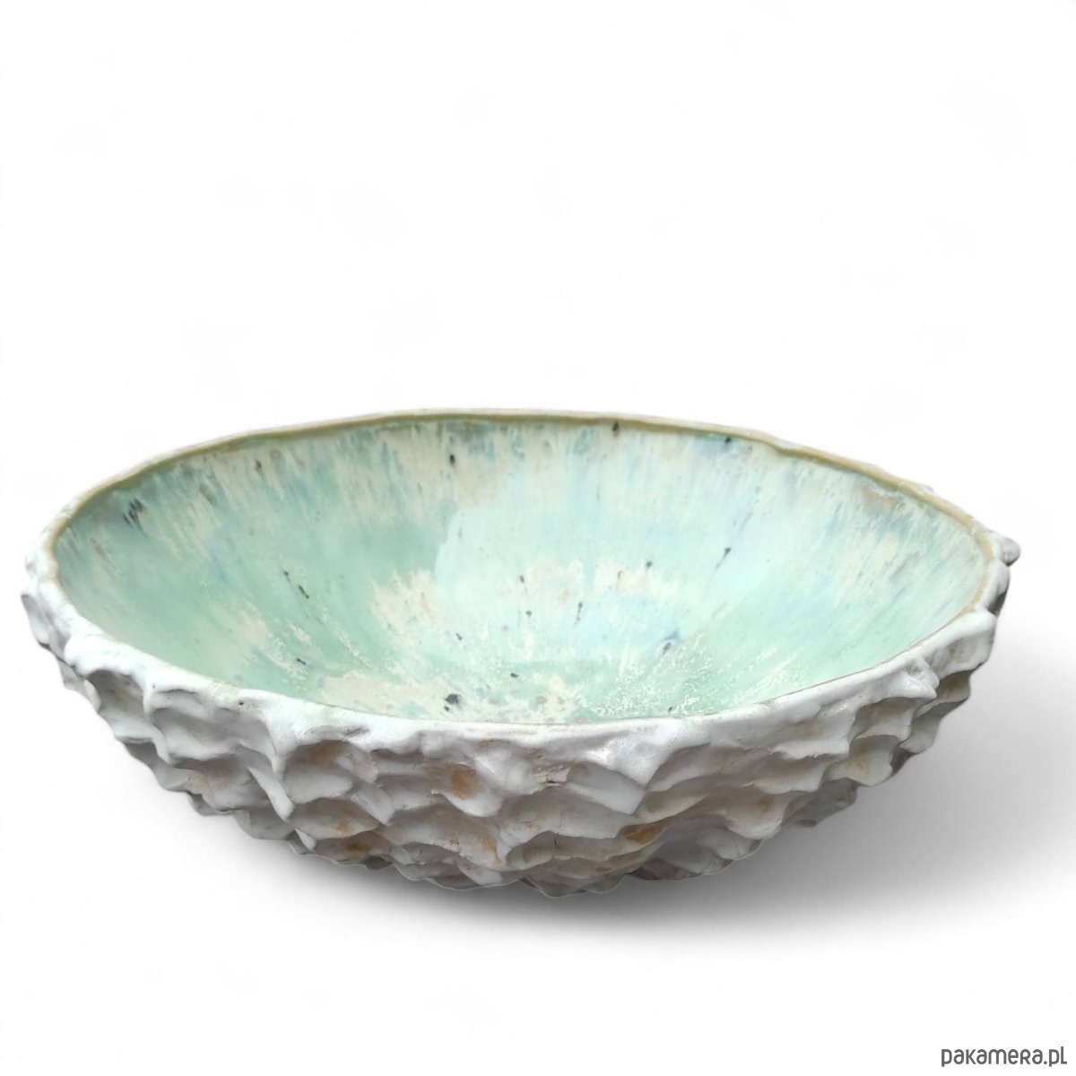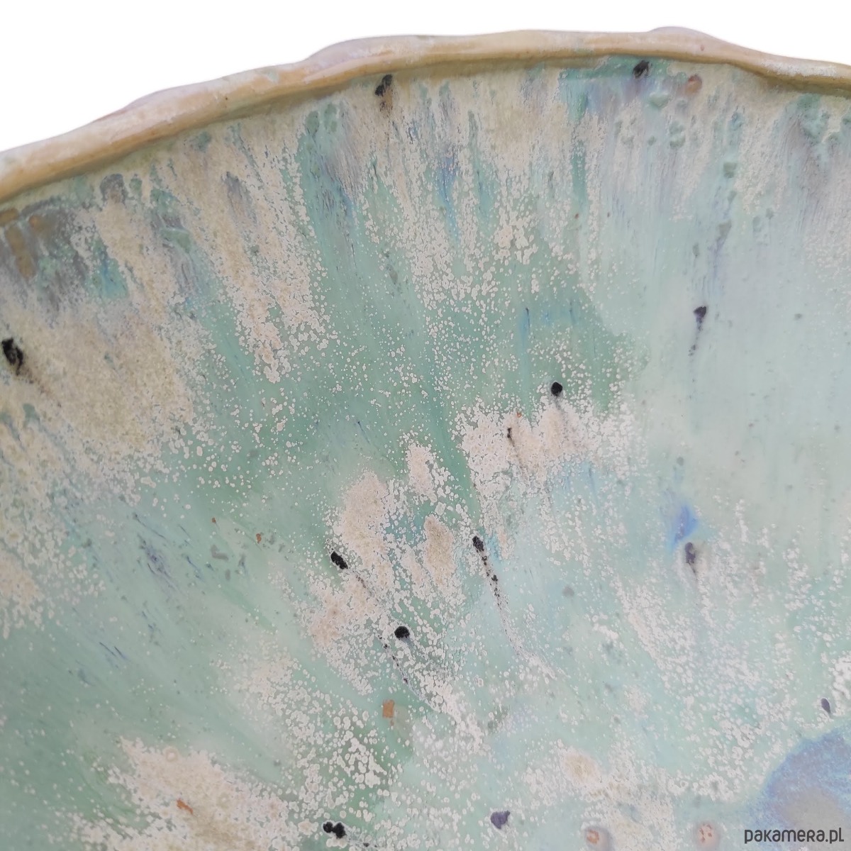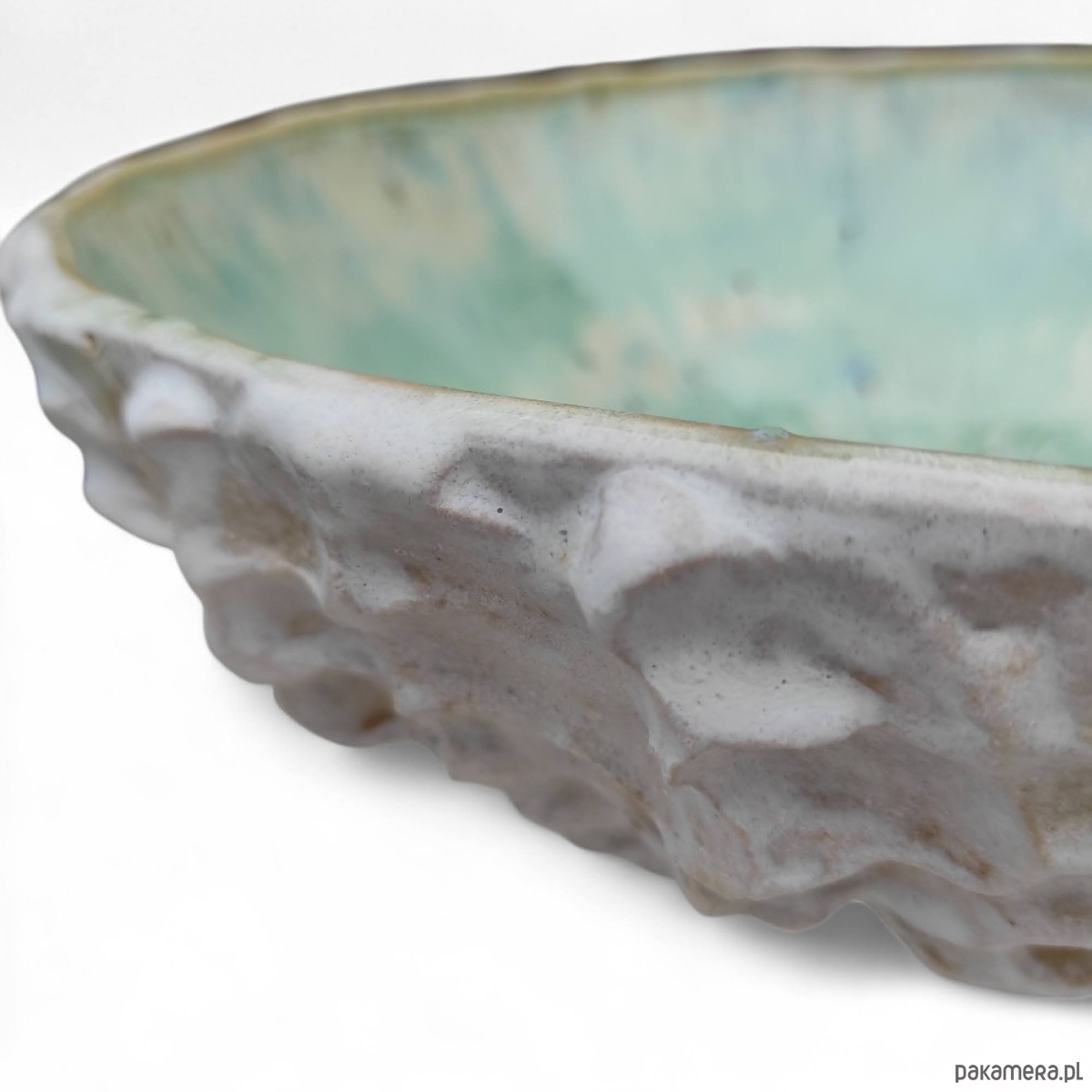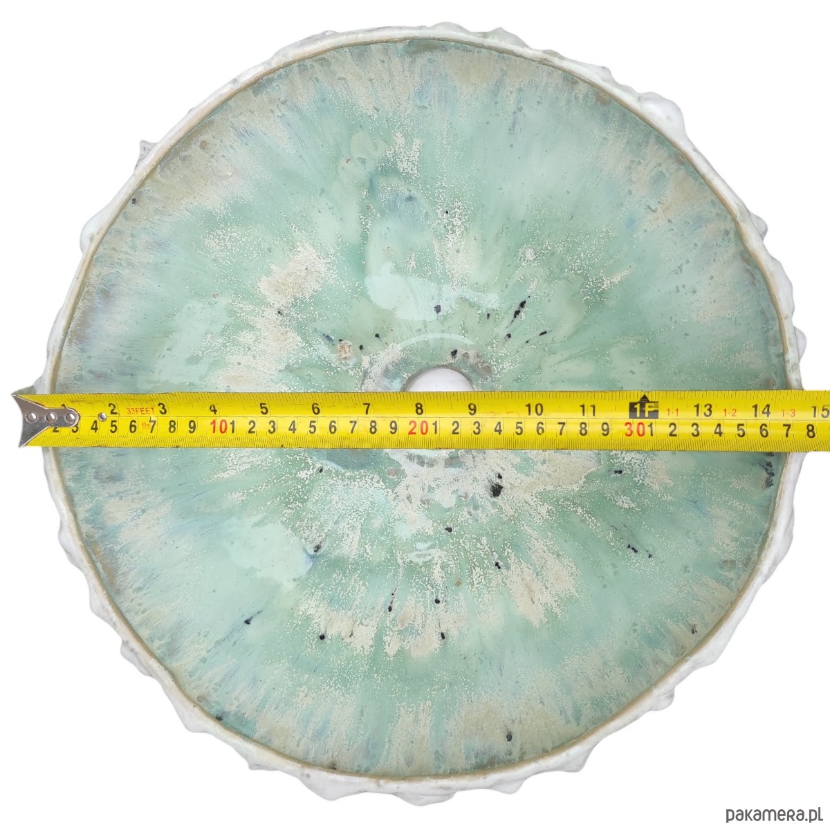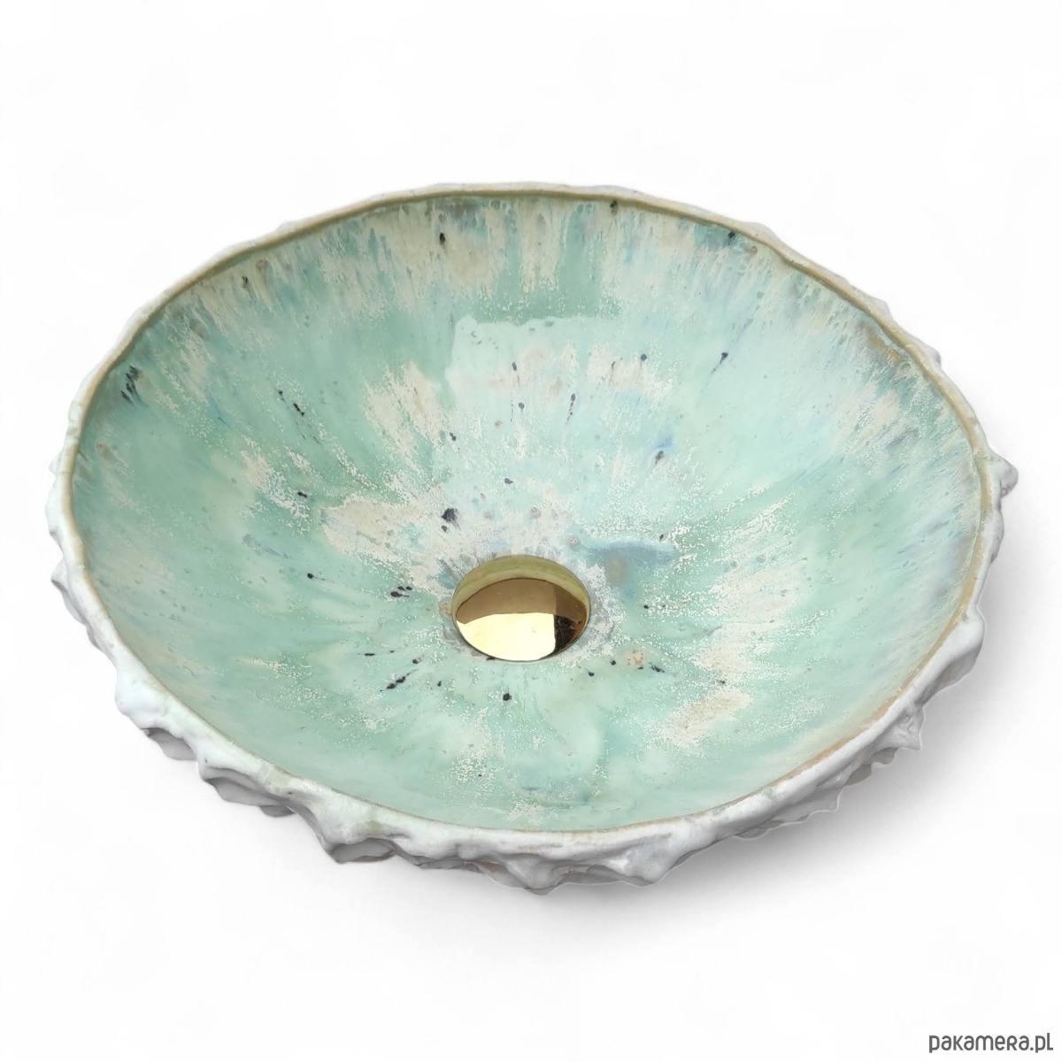 Niezwykle oryginalna umywalka nablatowa. Na zewnątrz matowa w ciepłym odcieniu bieli, w środku seledynowa z drobnymi beżowymi "kryształami"