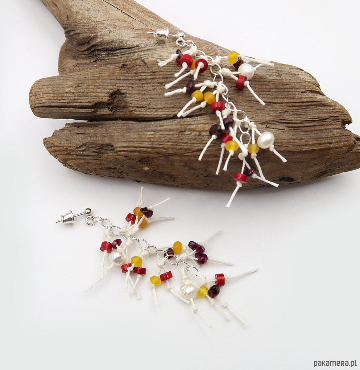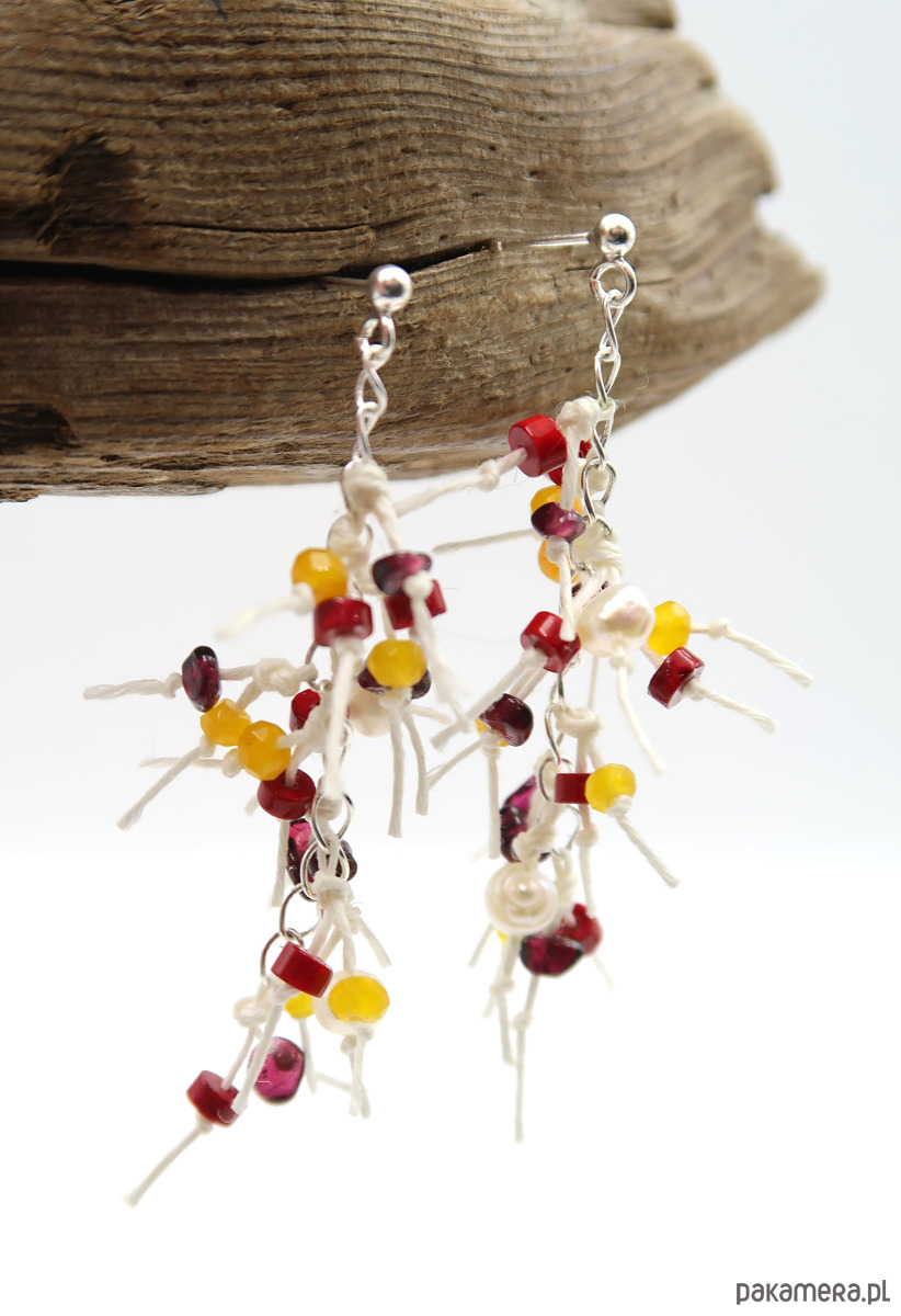 Delikatne kolczyki wykonane na bazie srebrnych łańcuszków oraz białej przędzy lnianej. W kompozycji wykorzystano chalcedon, perły słodkowodne, granat i koralowiec, których naturalne barwy i struktury nadają biżuterii subtelną energię oraz miękki, szlachetny blask.