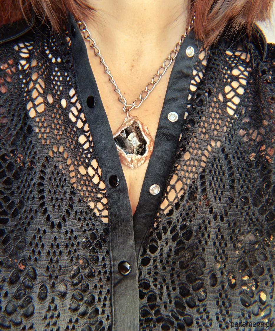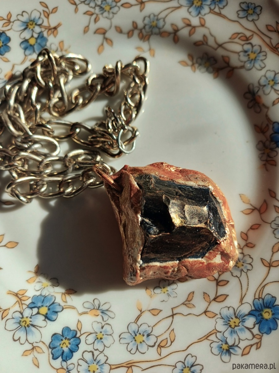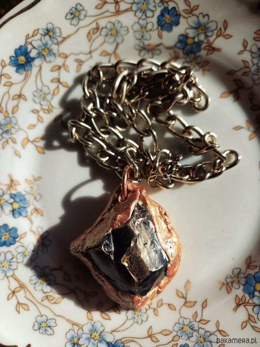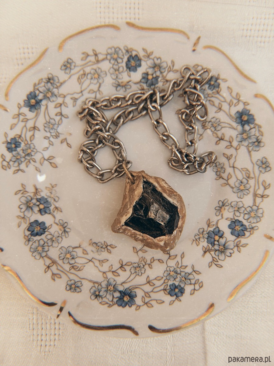 Surowa bryłka obsydianu, muśnięta lśnieniem i zatopiona w glinie, na łańcuszku vintage.
