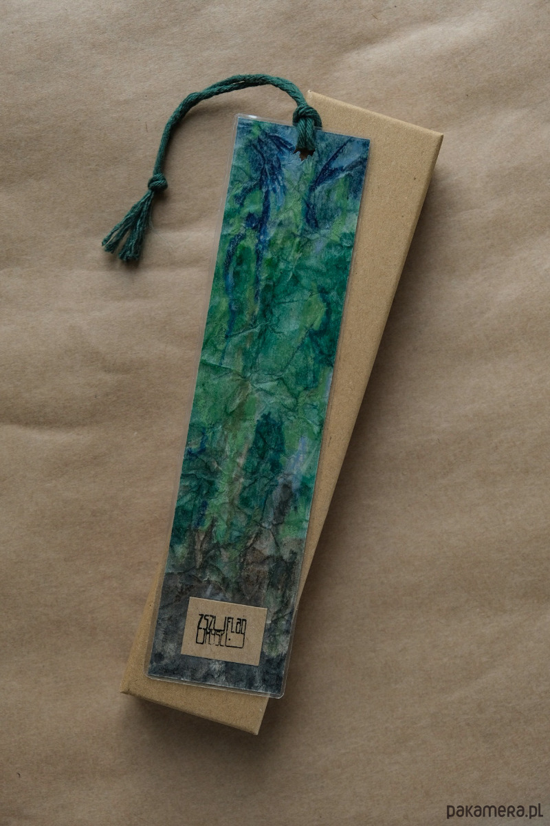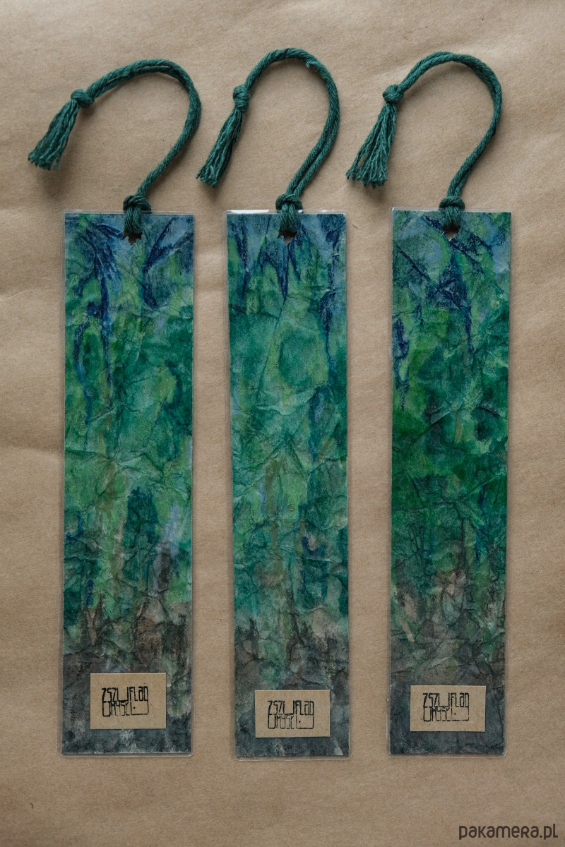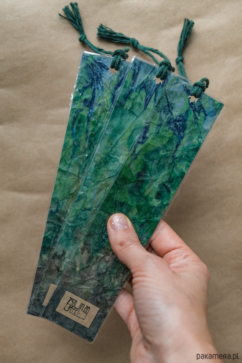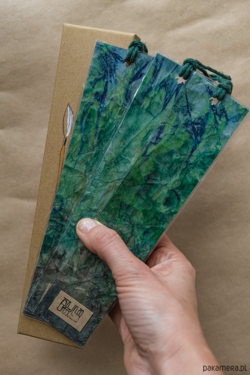 Zakładki zostały namalowane ręcznie akwarelami. Przedstawiają abstrakcyjną wizję lasu w kolorach dzikich drzew.