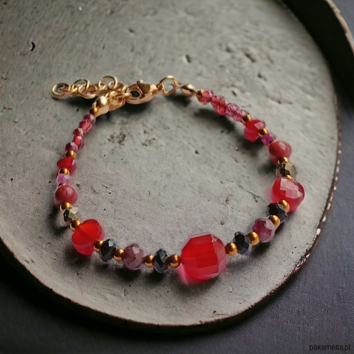 użyte kamienie (wielkość od 3 do 9mm): karneol, granat, rubin, czarny turmalin, jaspis czerwony, piryt oraz złoty hematyt 2mm (przekładki)
