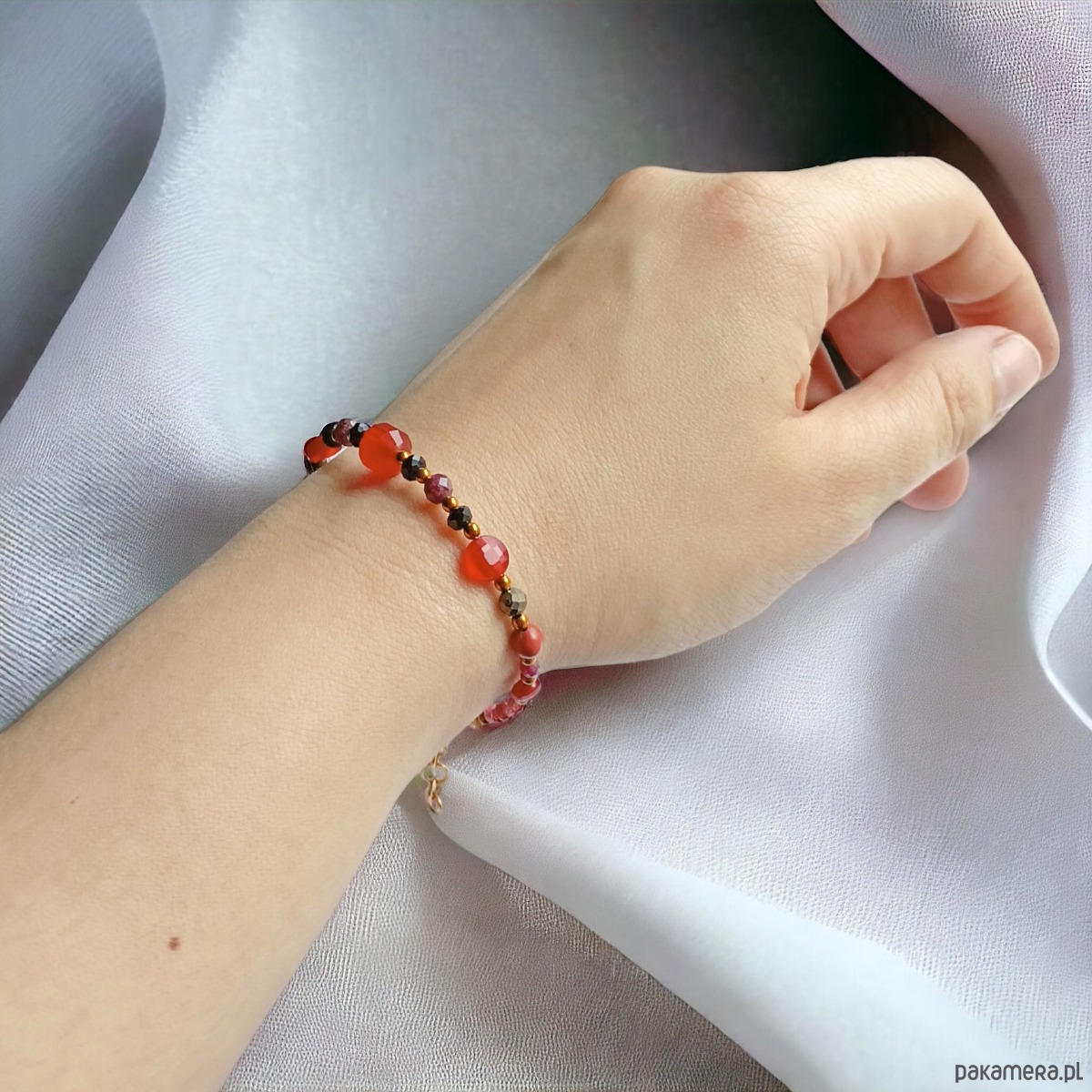 użyte kamienie (wielkość od 3 do 9mm): karneol, granat, rubin, czarny turmalin, jaspis czerwony, piryt oraz złoty hematyt 2mm (przekładki)