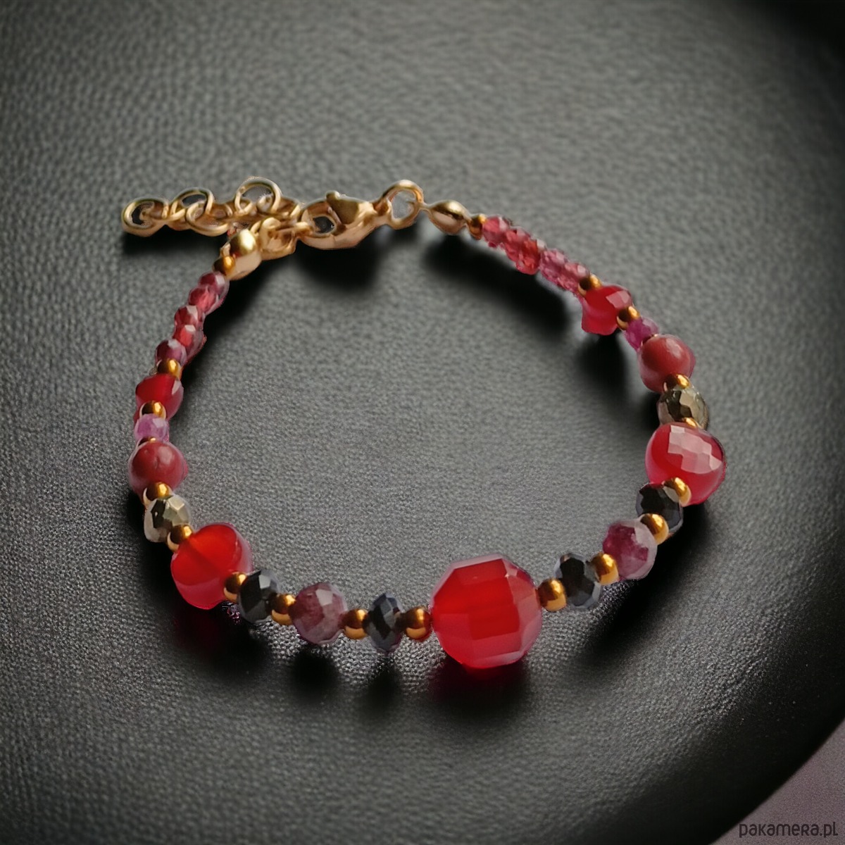 użyte kamienie (wielkość od 3 do 9mm): karneol, granat, rubin, czarny turmalin, jaspis czerwony, piryt oraz złoty hematyt 2mm (przekładki)
