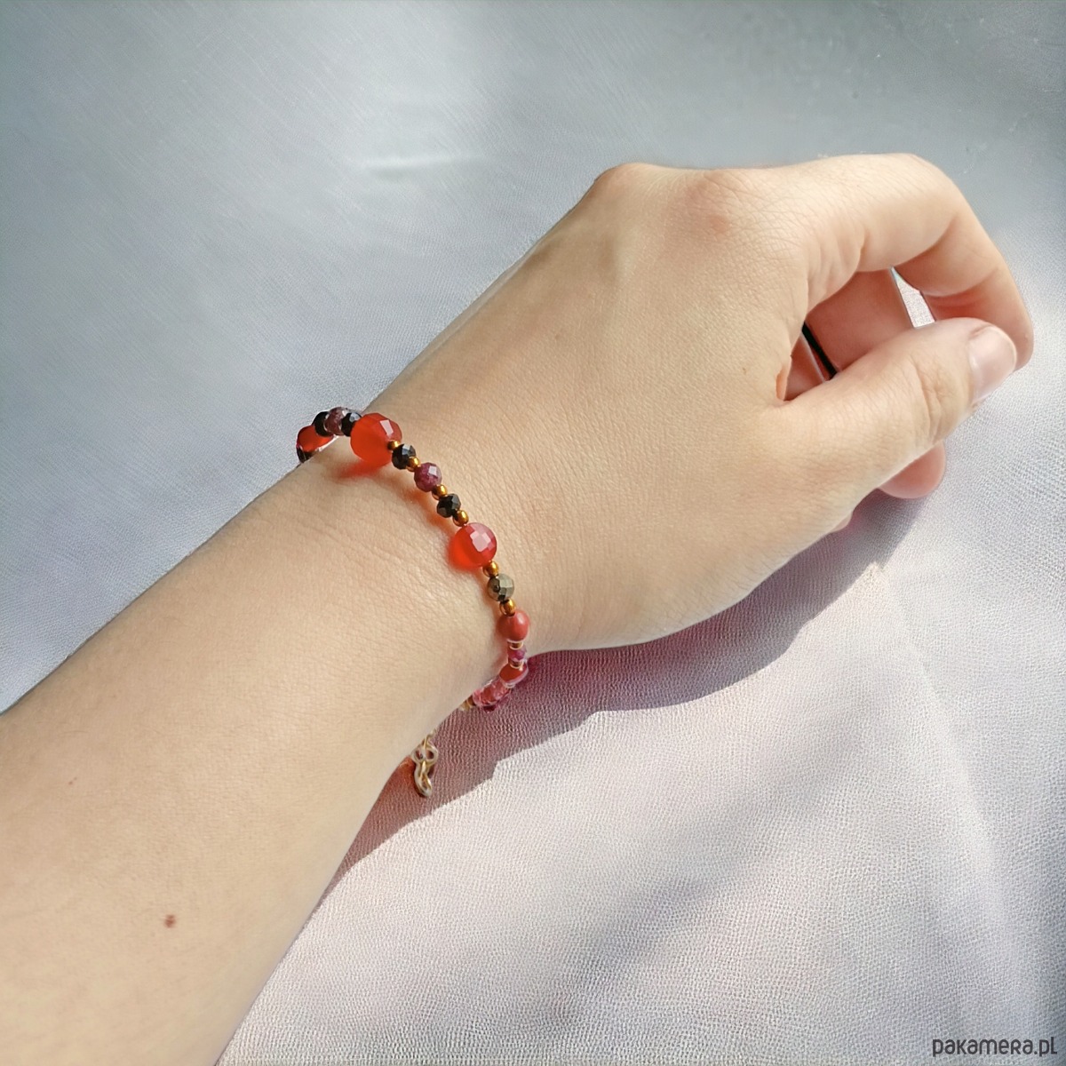 użyte kamienie (wielkość od 3 do 9mm): karneol, granat, rubin, czarny turmalin, jaspis czerwony, piryt oraz złoty hematyt 2mm (przekładki)