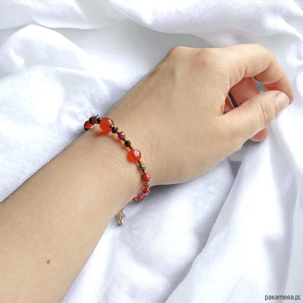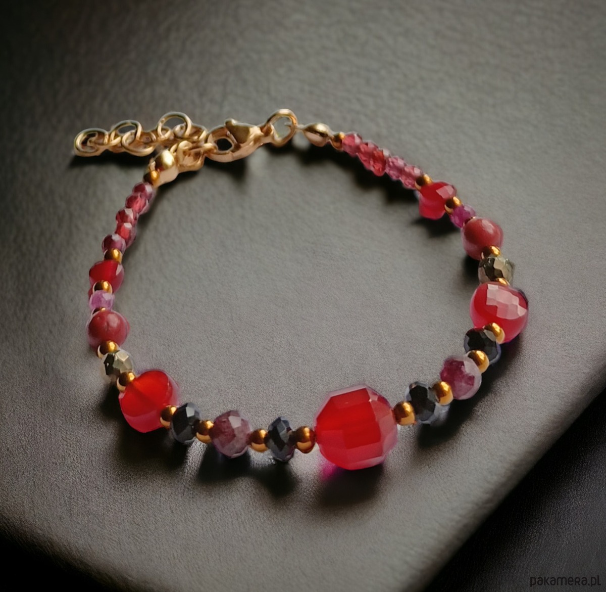 użyte kamienie (wielkość od 3 do 9mm): karneol, granat, rubin, czarny turmalin, jaspis czerwony, piryt oraz złoty hematyt 2mm (przekładki)