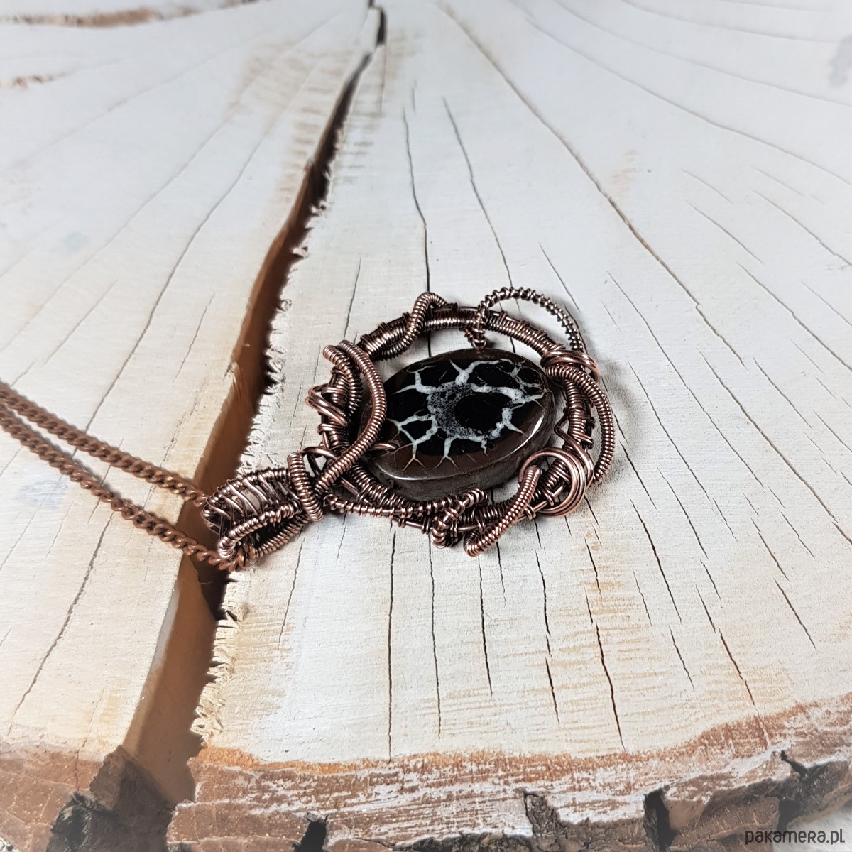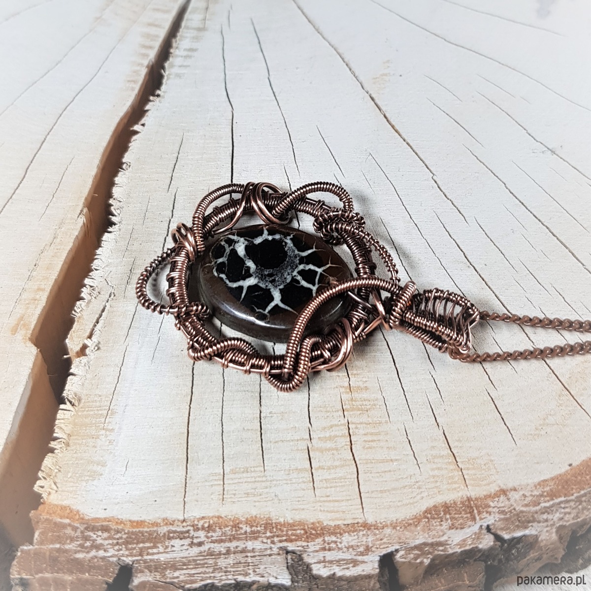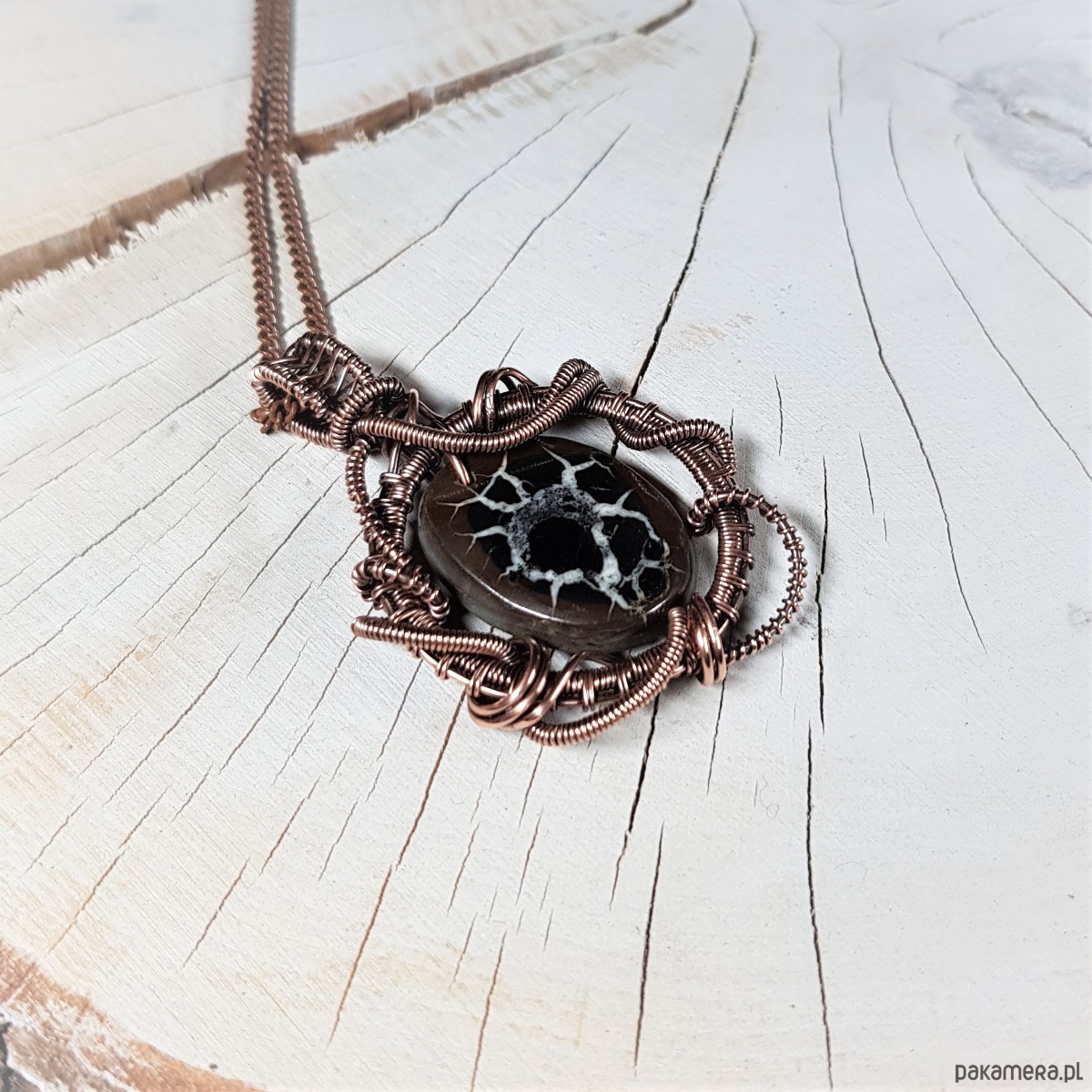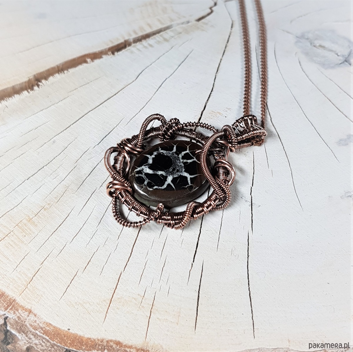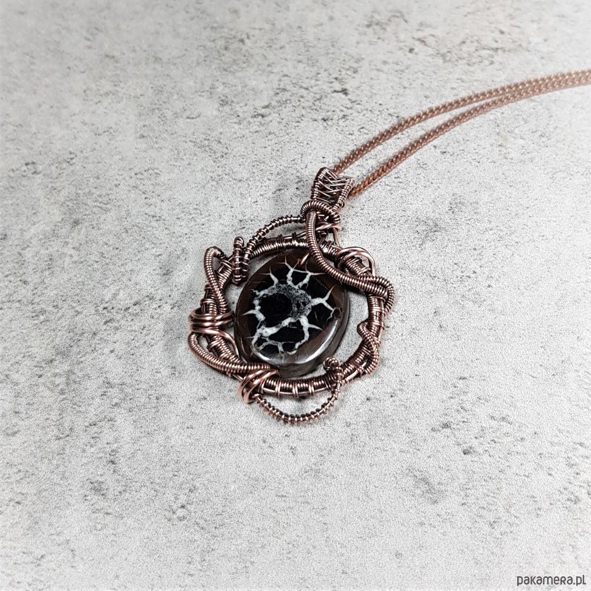 Zawieszka na łańcuszku z oryginalnego okazu septarianu zwanego smoczym kamieniem. Wrażenie spękań charakterystyczne dla smoczego kamienia nadaje zawieszce antycznego, eleganckiego wyglądu. Naszyjnik zrobiony ręcznie z miedzi pracochłonną metodą wire-wrappingu. Wymiary naszyjnika 48x34, zawieszony na łańcuszku standardowej długości około 50cm. Całość bardzo spokojna, elegancka, oryginalna.