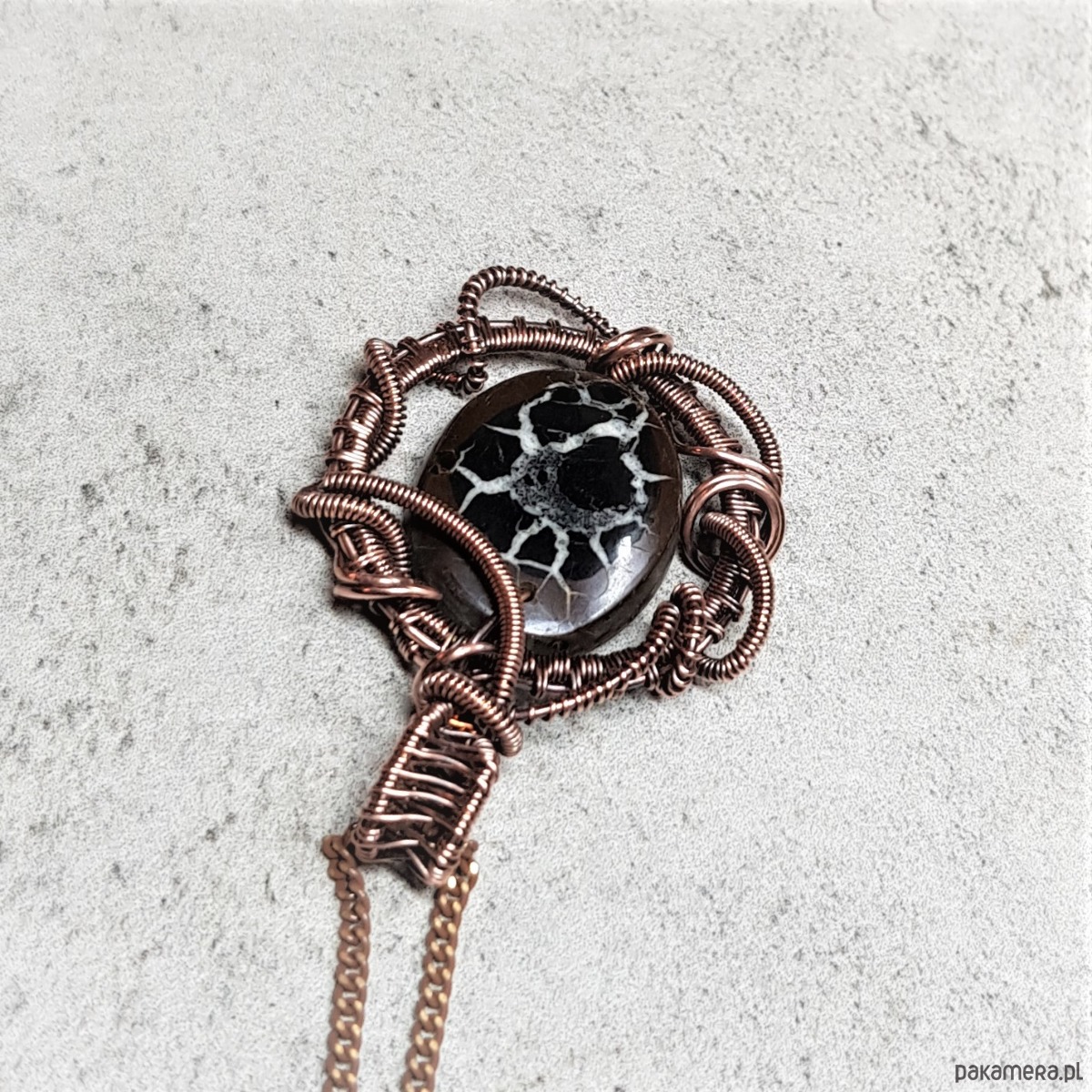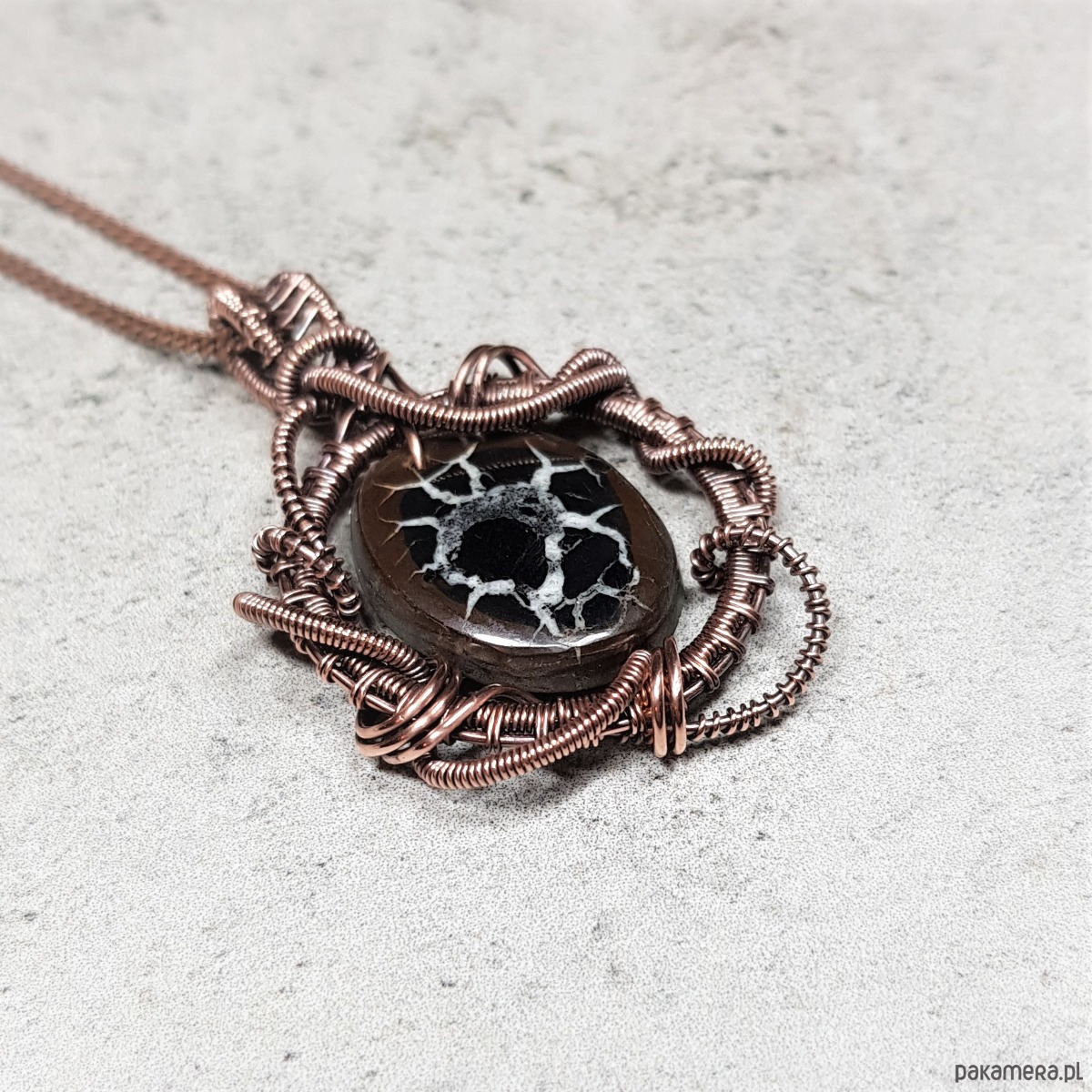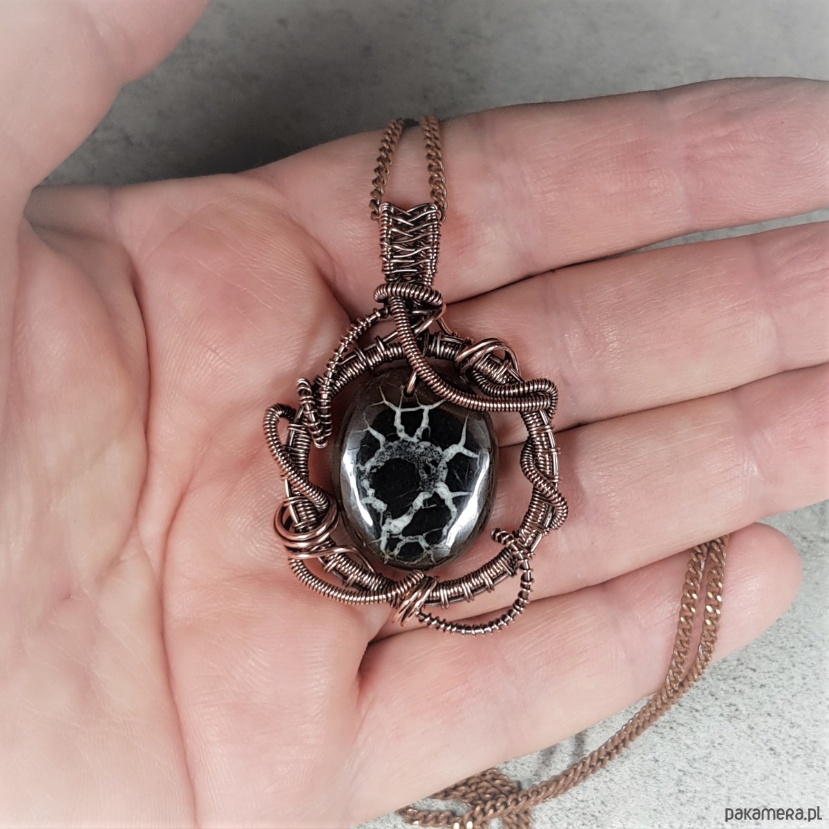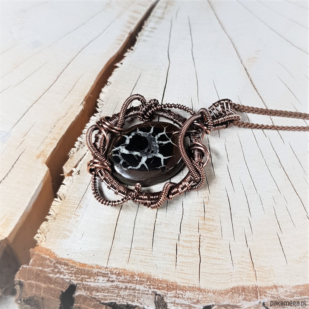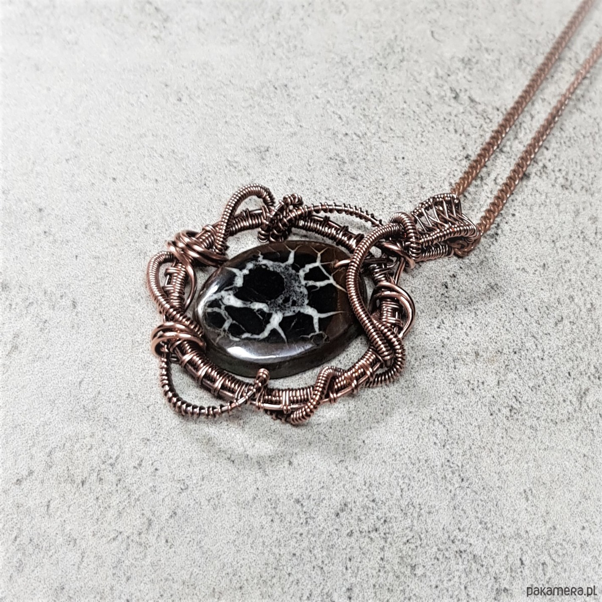 Zawieszka na łańcuszku z oryginalnego okazu septarianu zwanego smoczym kamieniem. Wrażenie spękań charakterystyczne dla smoczego kamienia nadaje zawieszce antycznego, eleganckiego wyglądu. Naszyjnik zrobiony ręcznie z miedzi pracochłonną metodą wire-wrappingu. Wymiary naszyjnika 48x34, zawieszony na łańcuszku standardowej długości około 50cm. Całość bardzo spokojna, elegancka, oryginalna.