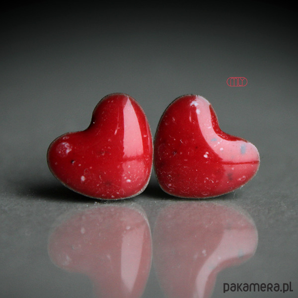 Ceramiczne kolczyki w formie sztyftów, ręcznie wykonane z delikatnej ciemnoszarej kamionki, jednostronnie szkliwione czerwonym subtelnie błyszczącym szkliwem z efektem drobnych plamek, na antyalergicznych sztyftach ze stali chirurgicznej w kolorze srebrnym. Średnica ok. 12mm.. Polecam