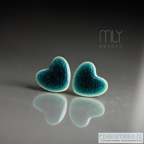 Ceramiczne kolczyki w formie sztyftów, ręcznie wykonane z delikatnej gliny kamionkowej, jednostronnie szkliwione zielonym szkliwem z efektem plamek, na antyalergicznych sztyftach w kolorze srebrnym. Średnica ok. 12mm