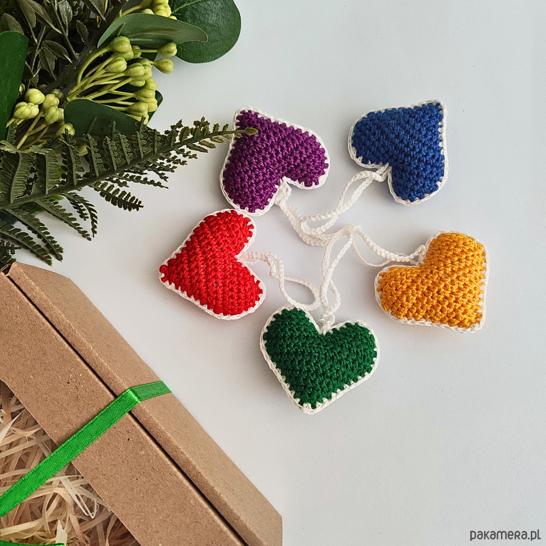 Zestaw 5 szt. świątecznych, szydełkowych serduszek. Serca wykonane z bawełny.
