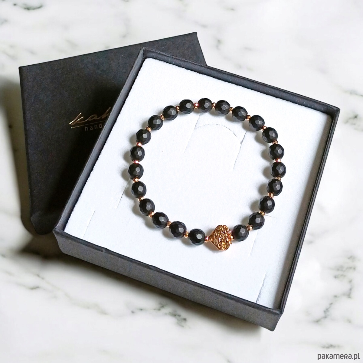 śliczna bransoletka na solidnej lince elastycznej, wykonana z fasetowanego MATOWEGO onyksu ok.6,5mm oraz kanciastego serca z platerowanej lawy wulkanicznej i przekładek ze złotego hematytu (fasetowane, drobne kuleczki 2mm)