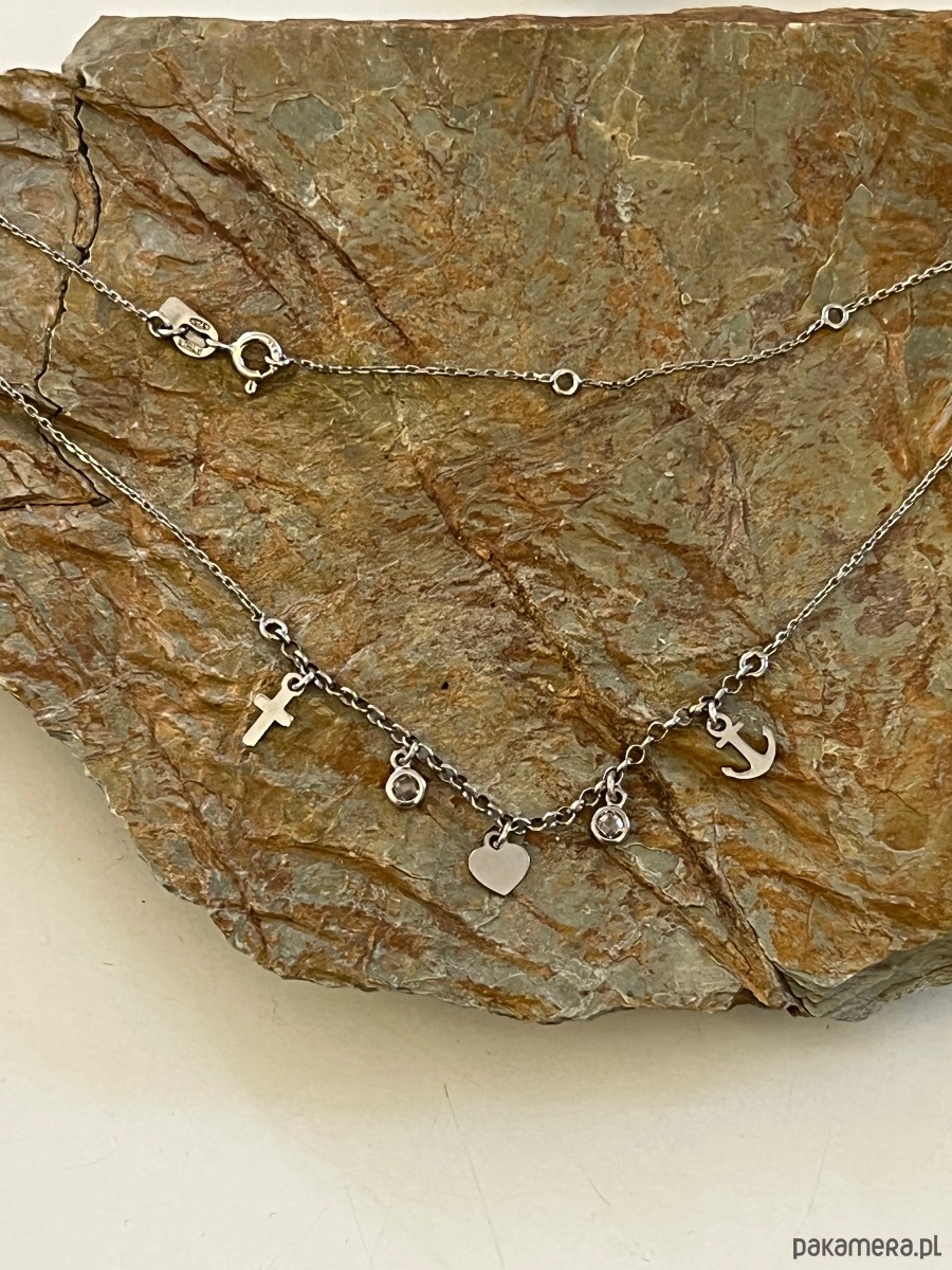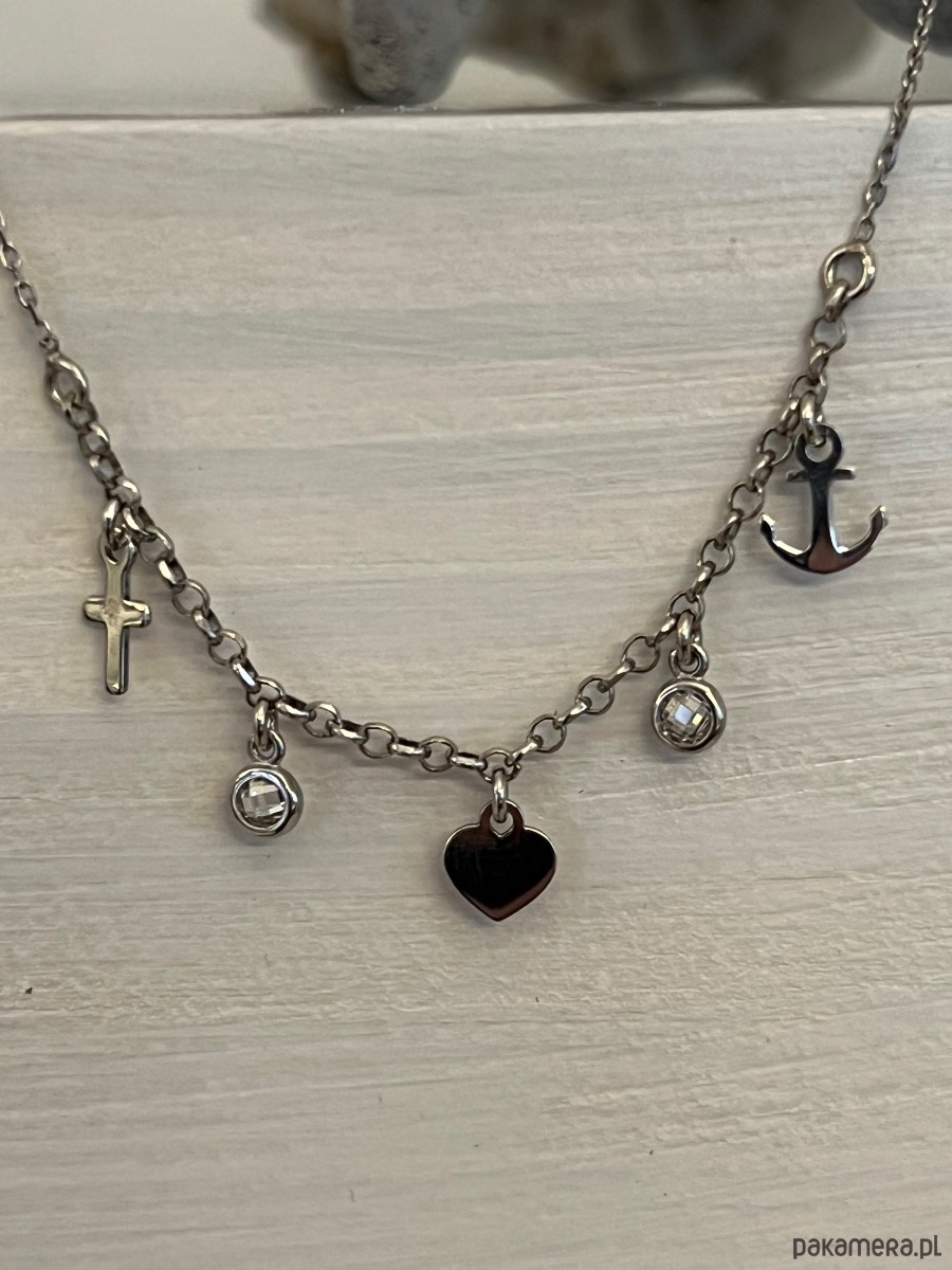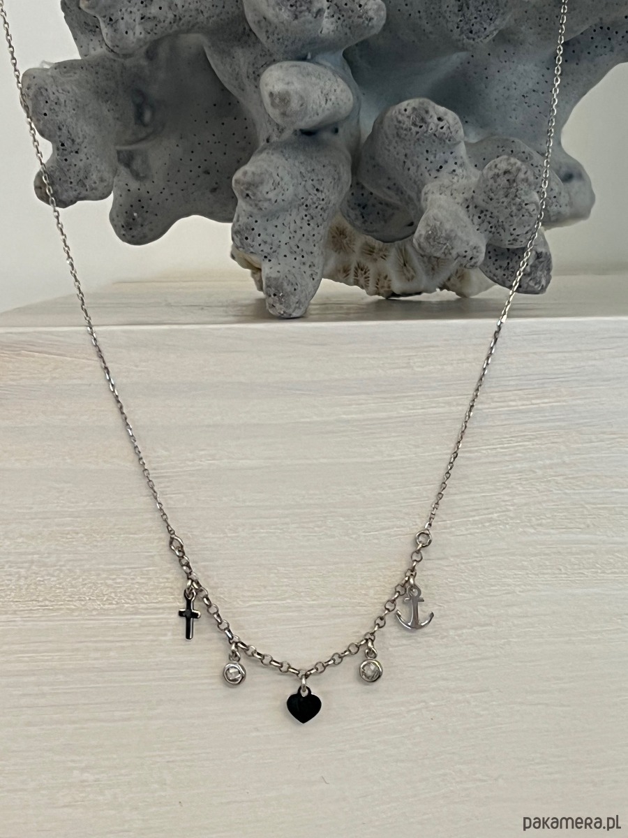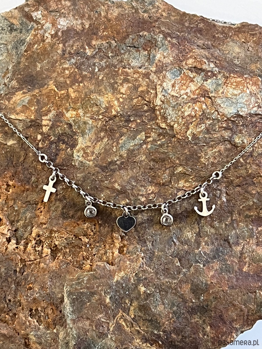 Naszyjnik srebrny z zawieszkami: serce, kotwica i krzyż – z cyrkoniami