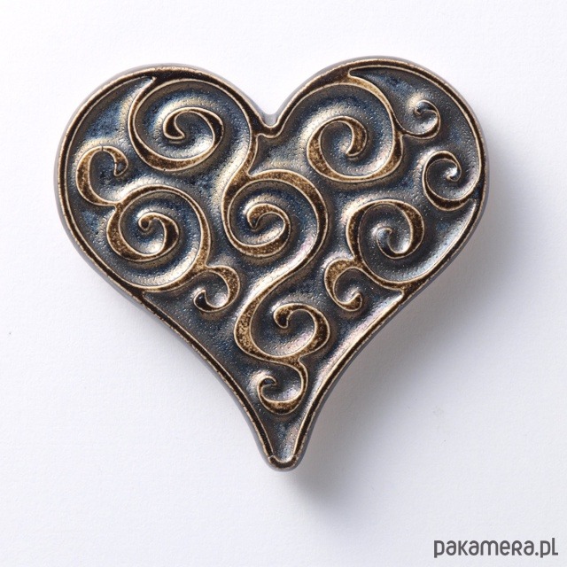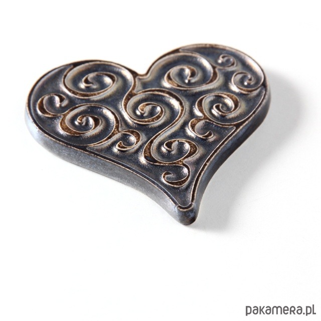 Ceramiczne, ornamentowe serce z naklejonym od spodu okrągłym magnesem. Wykonane z jasnej gliny, pokryte satynowym szkliwem.