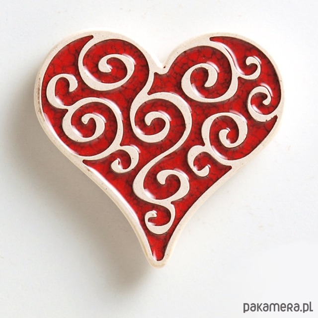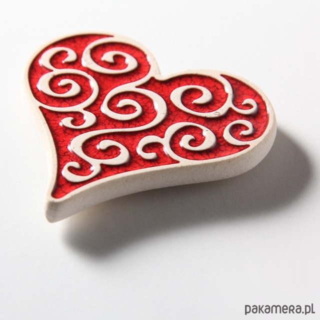 Ceramiczne, ornamentowe serce z naklejonym od spodu, bardzo silnym magnesem. Wykonane z jasnej gliny, pokryte błyszczącym, czerwonym szkliwem.