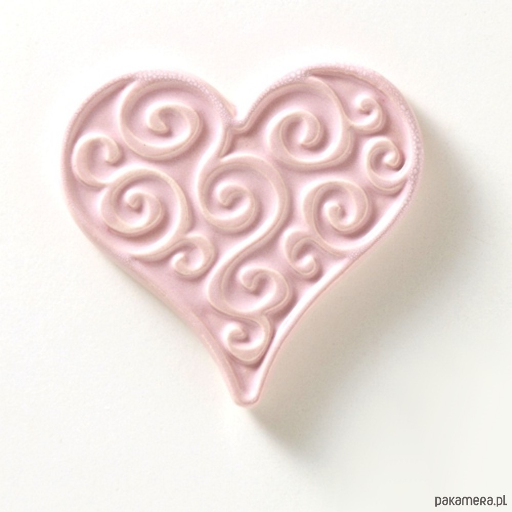 Ceramiczne, ornamentowe serce z naklejonym od spodu okrągłym, bardzo silnym magnesem. Wykonane z jasnej gliny, pokryte błyszczącym szkliwem.