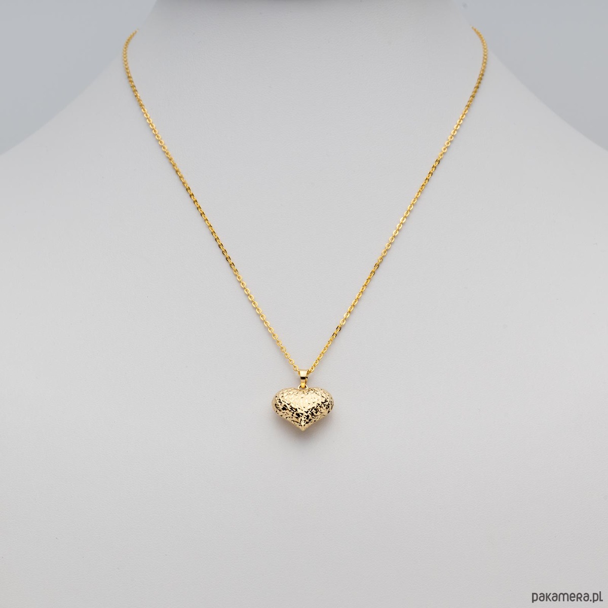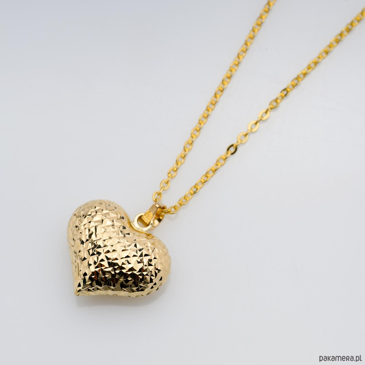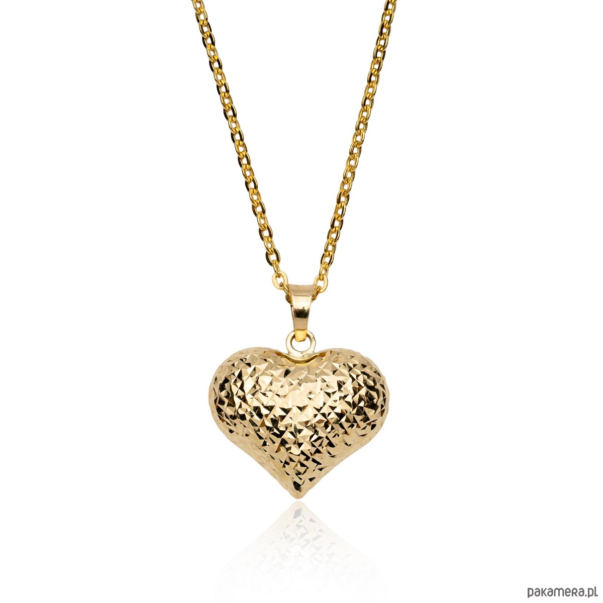 Złoty wisiorek dwustronny w kształcie pełnego, pękatego serca zdobionego nacięciami, o pomarszczonej strukturze które dodają mu blasku.