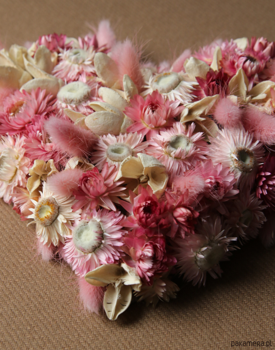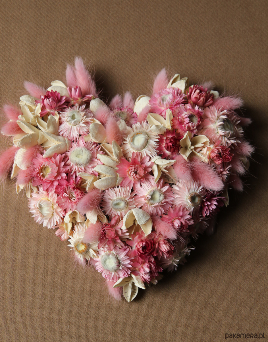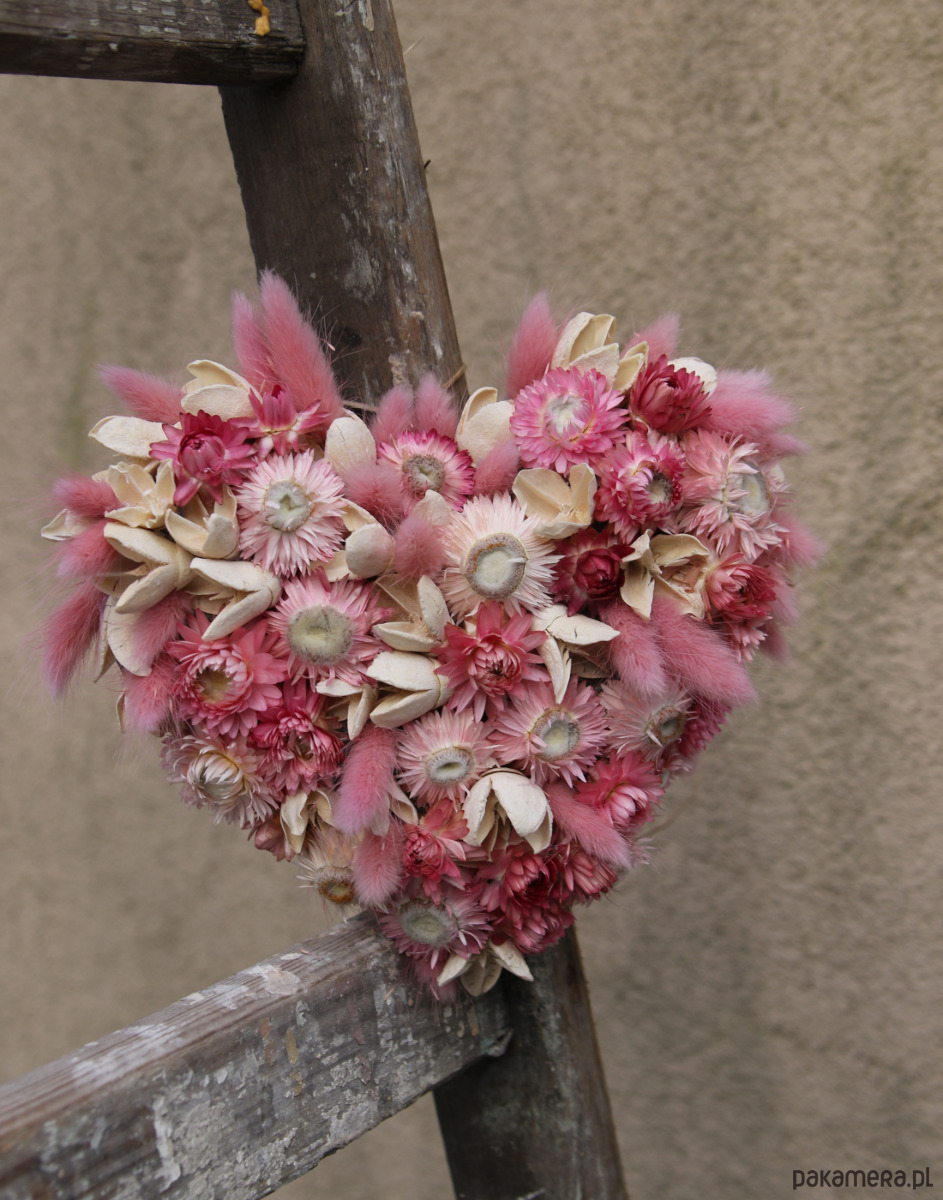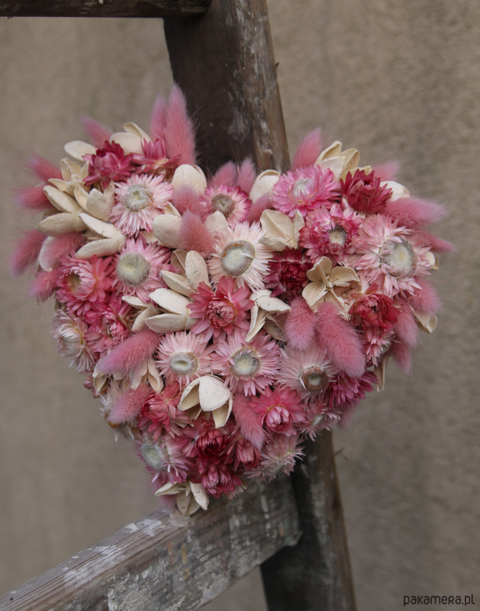 Wyjątkowa dekoracja w kształcie serca wykonana z różowych i kremowych suszonych kwiatów, suszu egzotycznego i traw ozdobnych. Romantyczna, delikatna i naturalna- wprowadza ciepły klimat do każdego wnętrza.