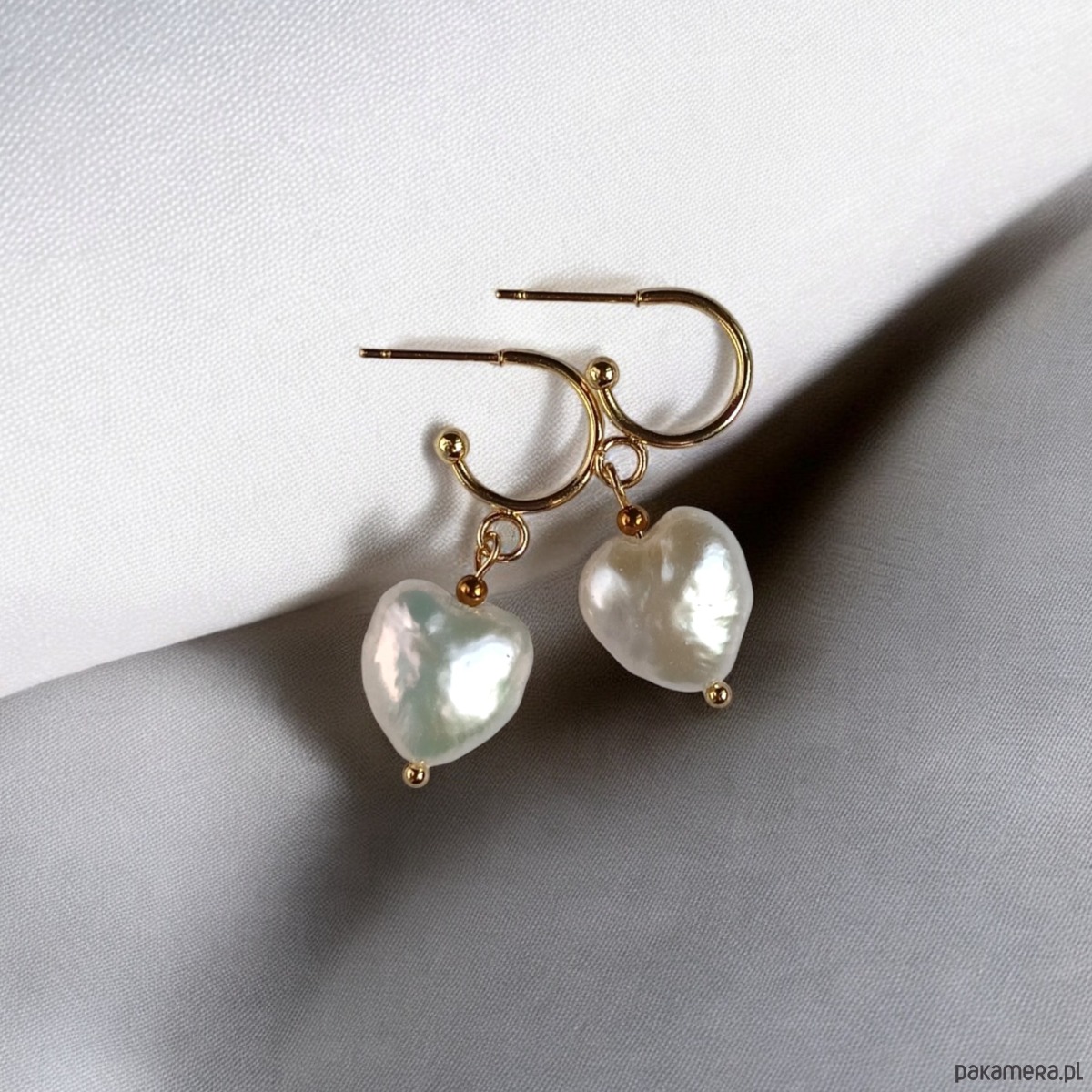 TUTAJ: kolczyki wykonane z przepięknych pereł hodowlanych w kształcie serca w klasycznym odcieniu złamanej bieli.