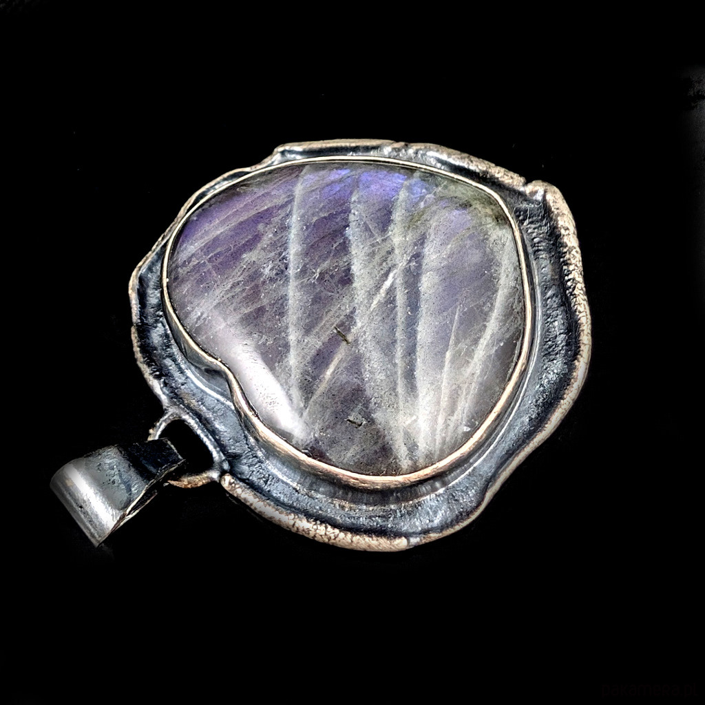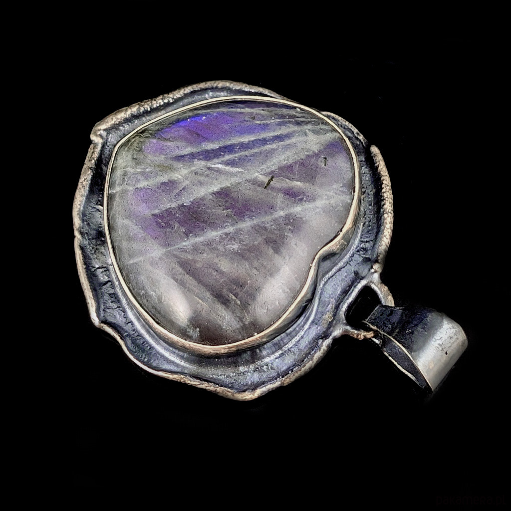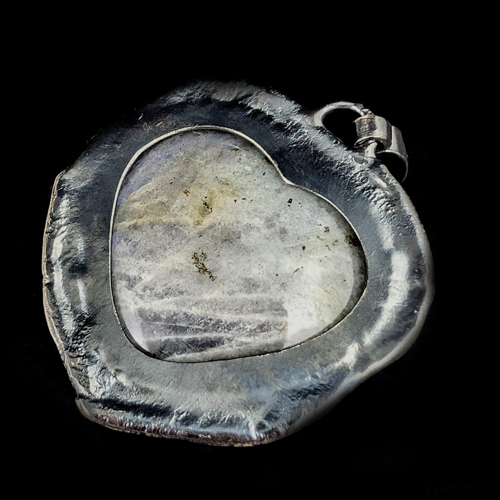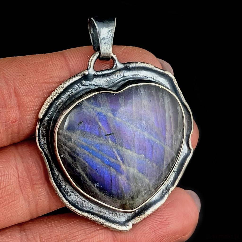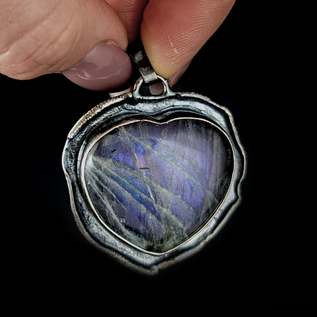 Romantyczny wisior z oprawionym w oksydowane srebro próby 925 labradorytem w kształcie pięknego serca. Oksydowana, surowa rama i charakterystyczne inkluzje podkreślają urodę kamienia. Wymiary całej oprawy 38 x 37 xmm, długosć z krawatką 52 mm, waga 22 g. Wisiorek zostanie zapakowany w ozdobne pudełeczko.