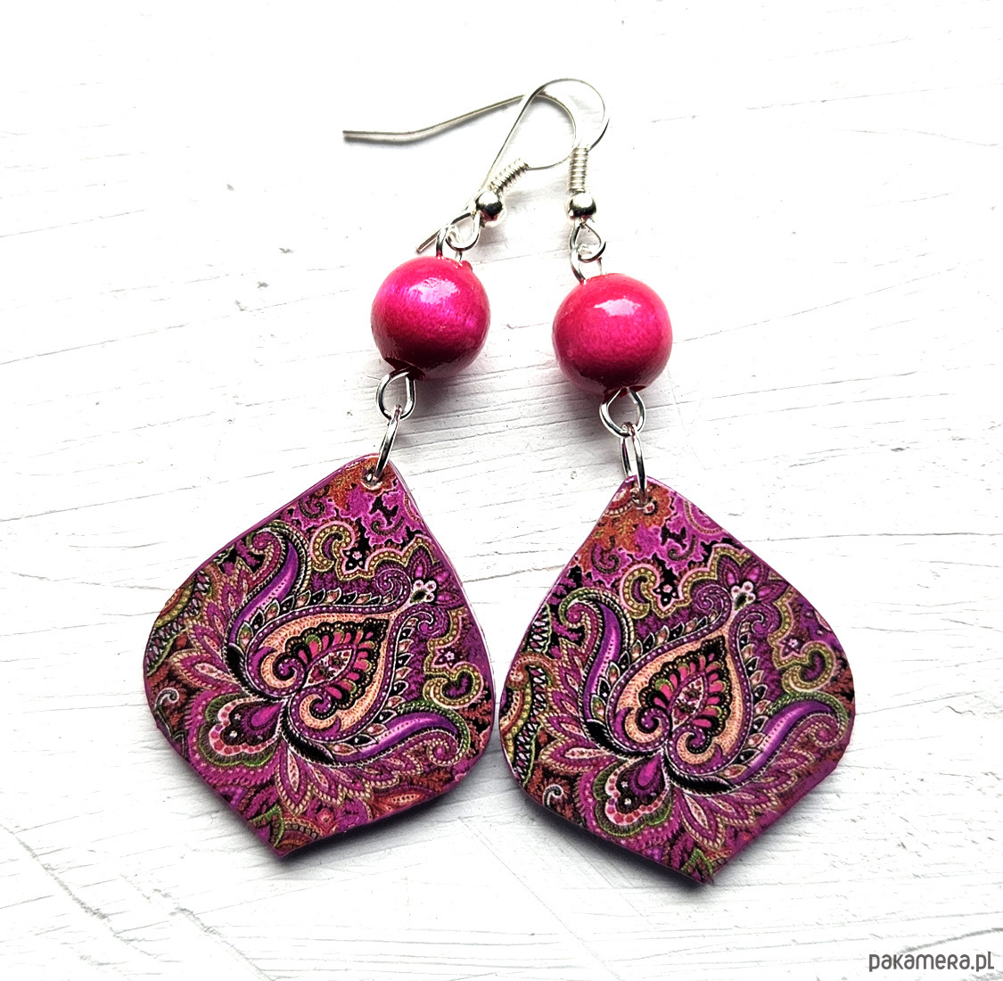 kolczyki drewniane, ozdobione metodą decoupage, dwustronne, starannie wykończone farbami akrylowymi i zabezpieczone wielokrotnie lakierem, koraliki drewniane, bigle posrebrzane, długość kolczyków bez bigli: 5,5 cm, szerokość: 3 cm, bardzo lekkie