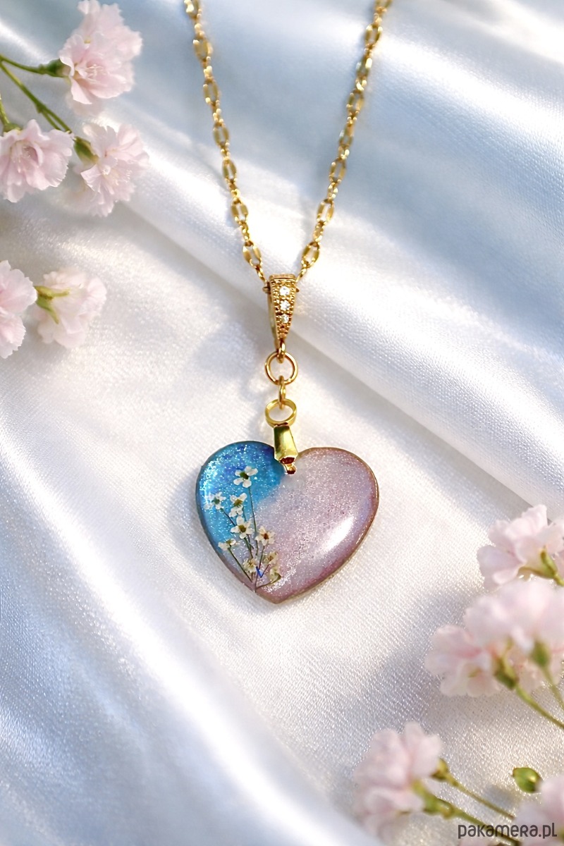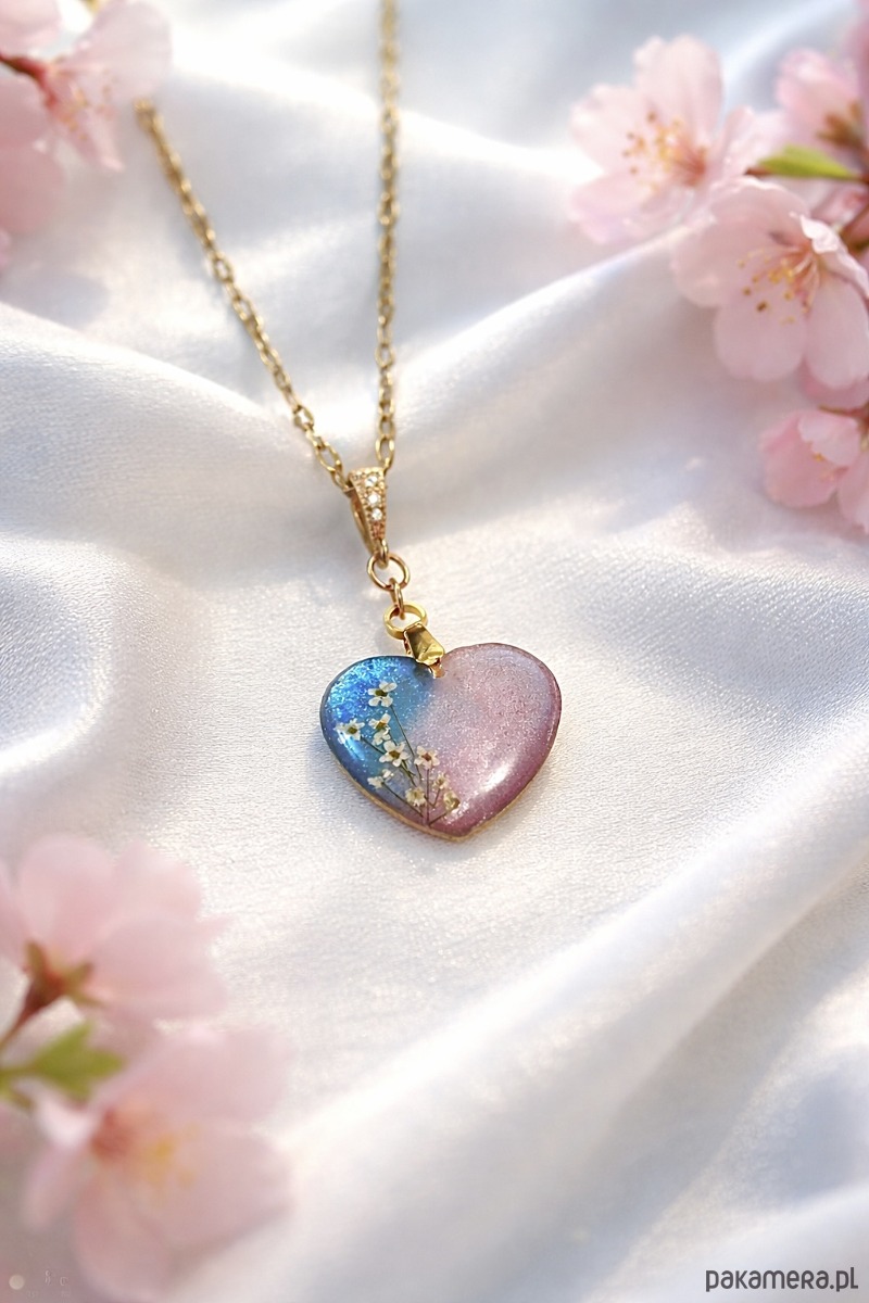 • Design: Ręcznie wykonane serce z żywicy, zatopione w delikatnym gradiencie błękitu nieba i pudrowego różu płatków sakury.