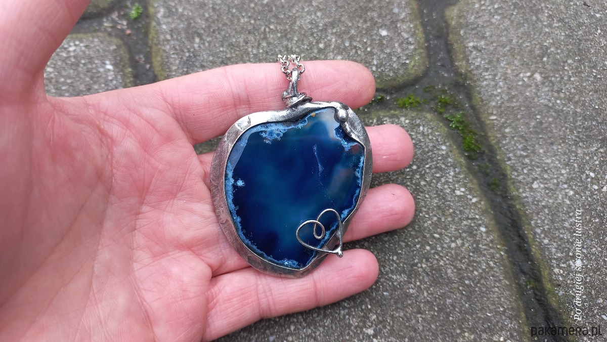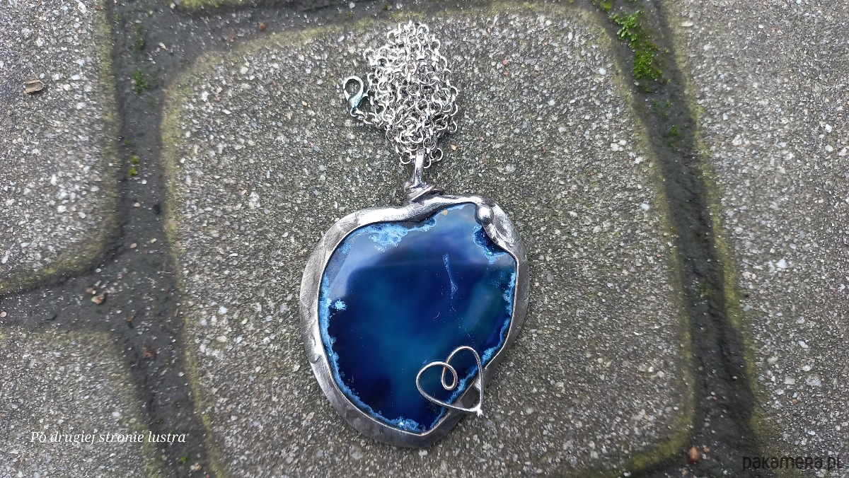 Wisiorek wykonany z miedzi, cyny i agatu. Wymiary ok. 5 na 5 cm. Zawieszony na łańcuszku o długości ok. 50 cm.