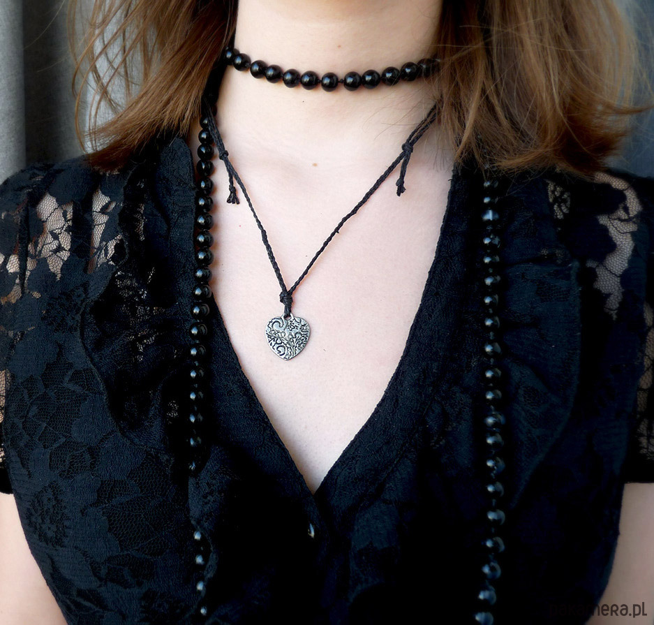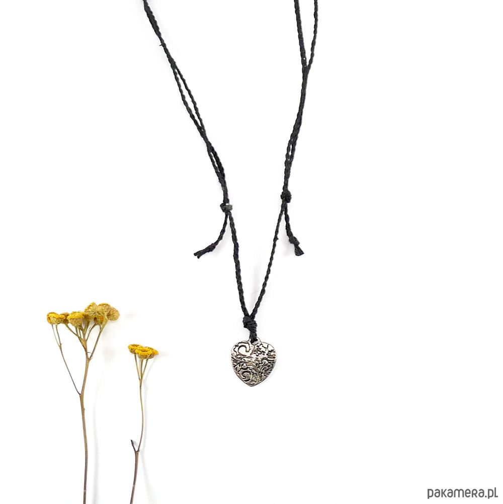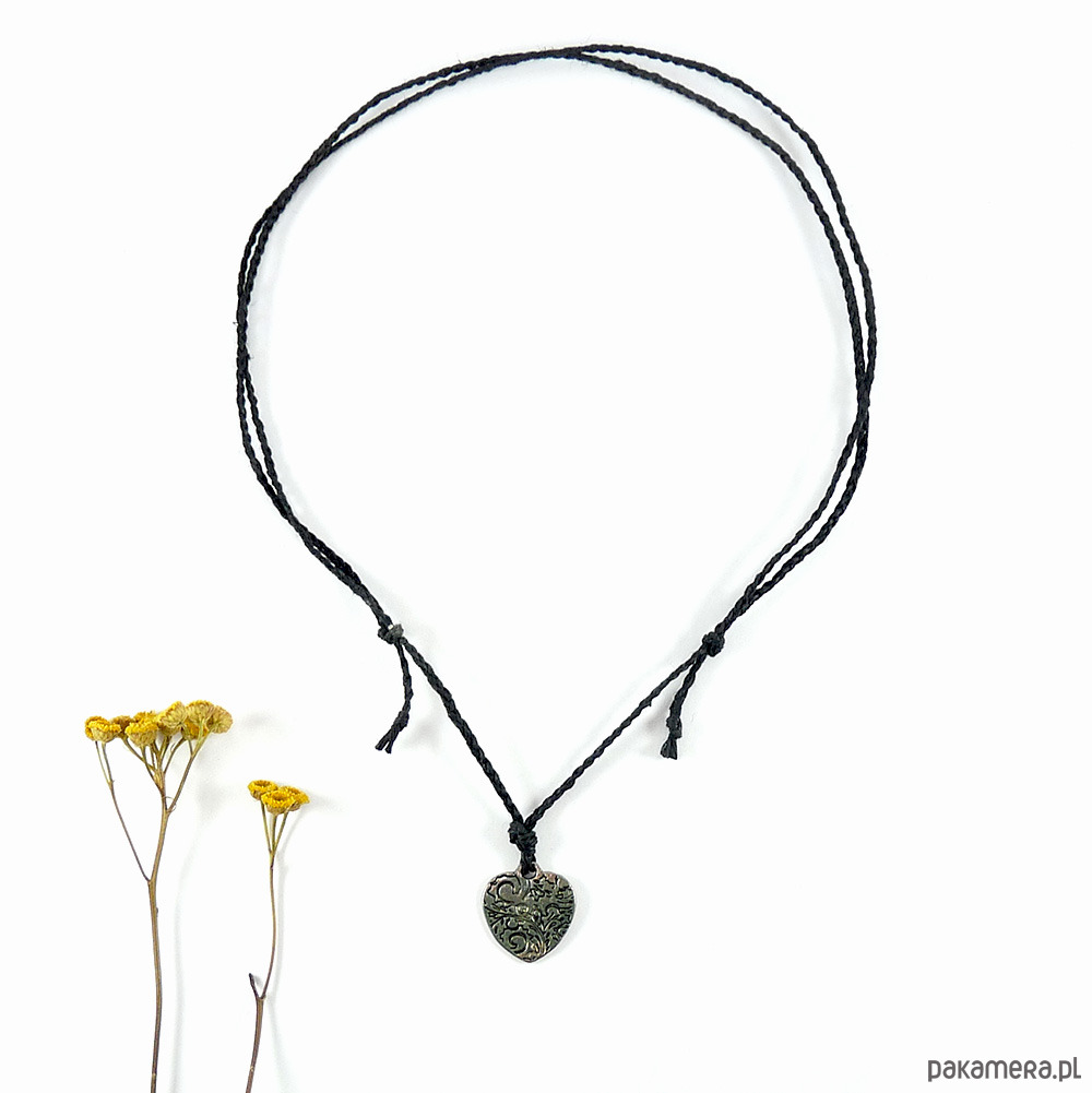 oksydowane metalowe serce 19x18 mm, czarny len spleciony w warkoczyk 2 mm