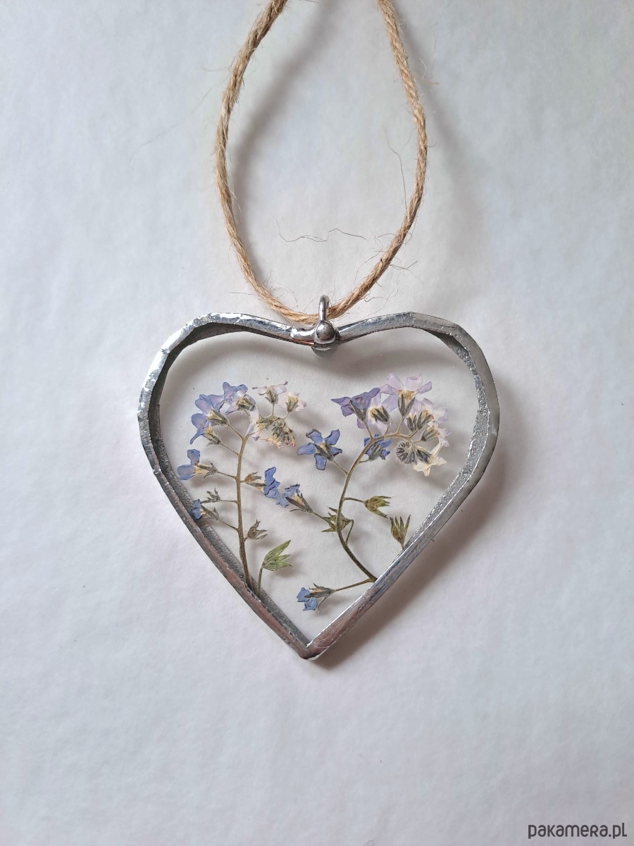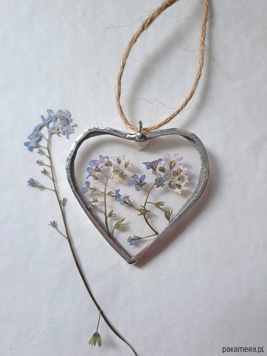 Witrażowe serce z zamkniętymi w szkle suszonymi niezapominajkami!