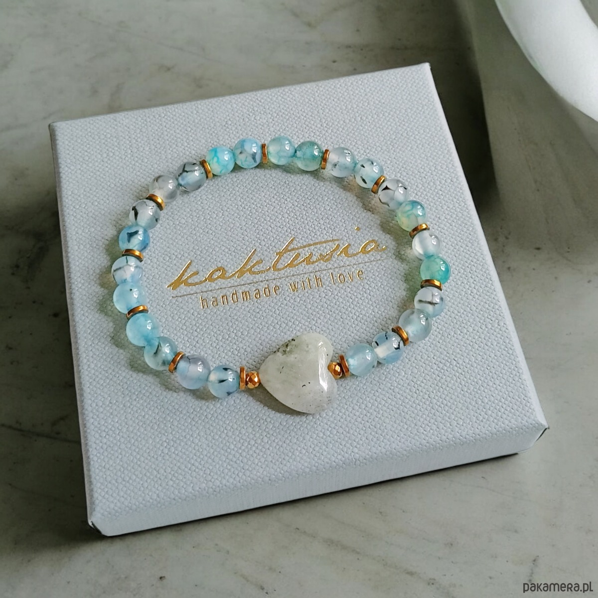 śliczna bransoletka na solidnej lince elastycznej, wykonana z agatu smoczego 6mm w odcieniach szarości i błękitu oraz cudnego serca z labradorytu ok. 14mm i przekładek ze złotego hematytu.