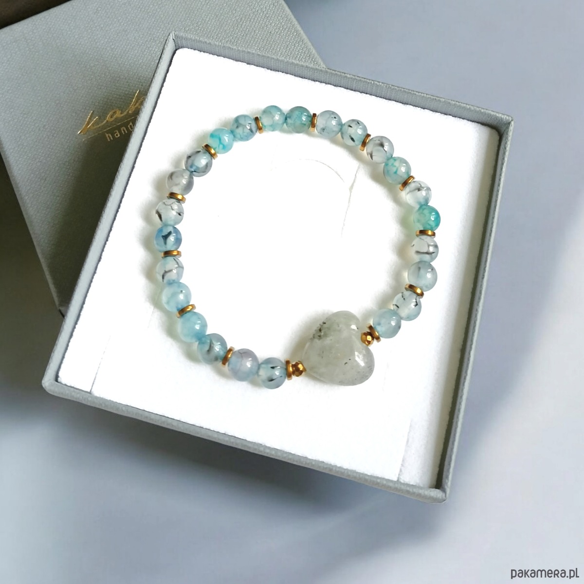 śliczna bransoletka na solidnej lince elastycznej, wykonana z agatu smoczego 6mm w odcieniach szarości i błękitu oraz cudnego serca z labradorytu ok. 14mm i przekładek ze złotego hematytu.