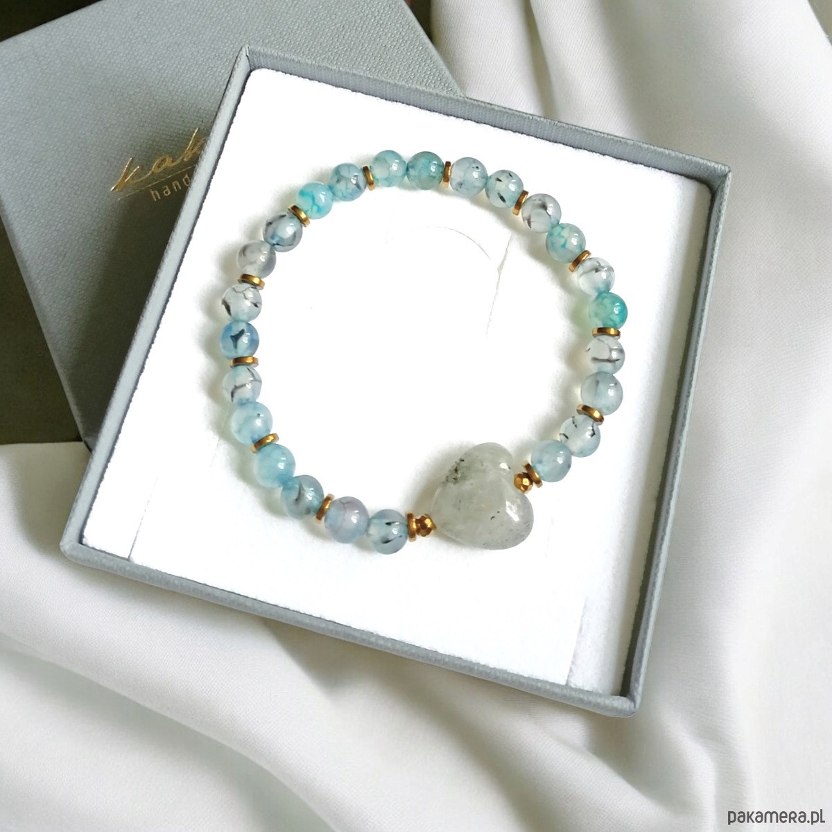śliczna bransoletka na solidnej lince elastycznej, wykonana z agatu smoczego 6mm w odcieniach szarości i błękitu oraz cudnego serca z labradorytu ok. 14mm i przekładek ze złotego hematytu.