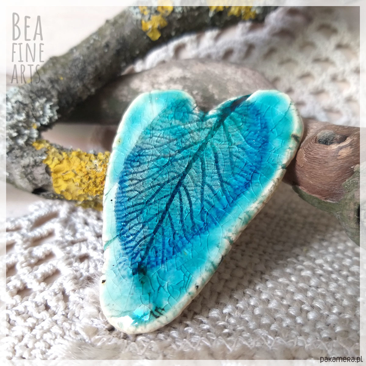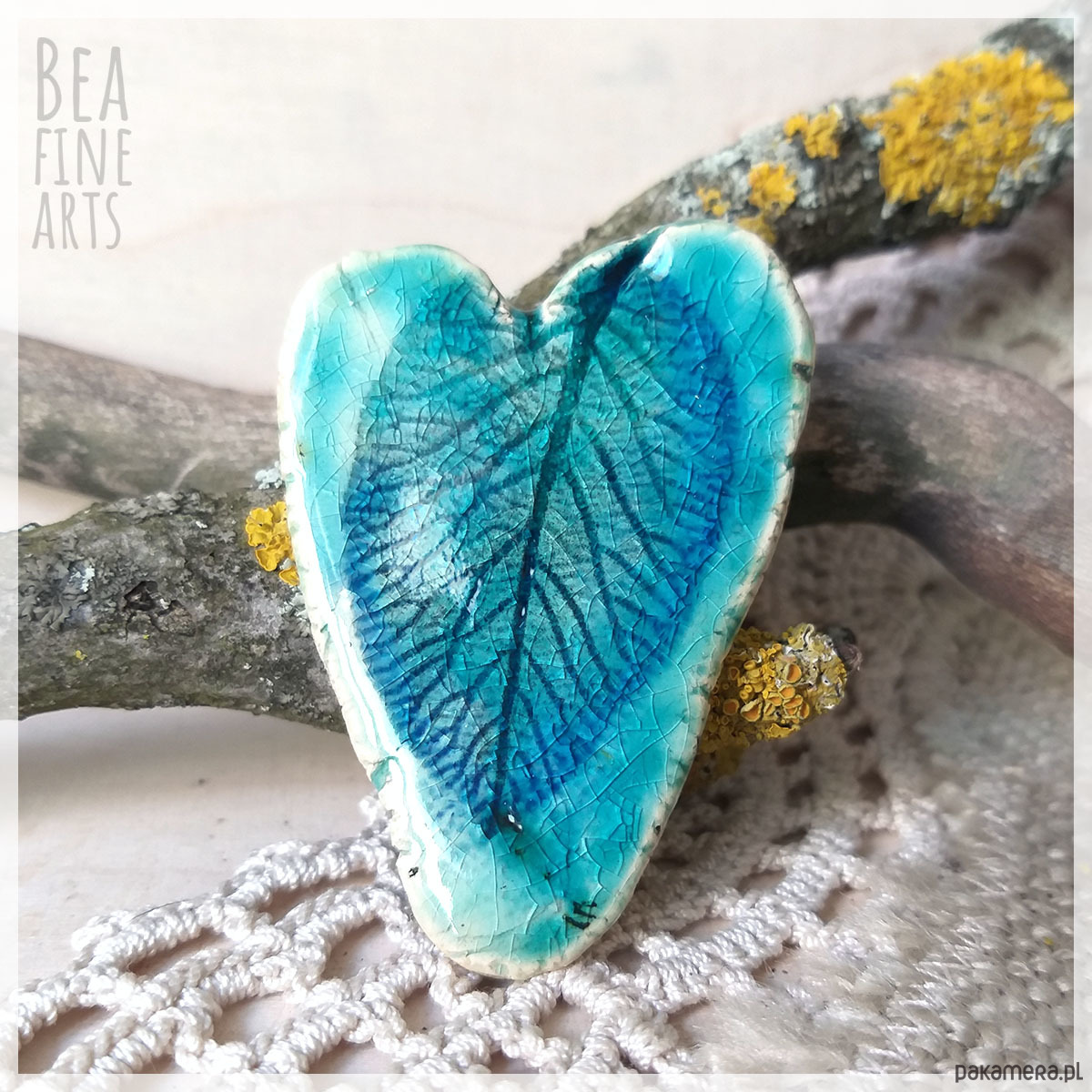 Śliczne ceramiczne serce - magnes z odciskiem liścia, w kolorach turkusowo - zielonych, z surowymi naturalnymi brzegami. Ozdobi Twój dom lub będzie fajnym prezentem dla kogoś bliskiego.