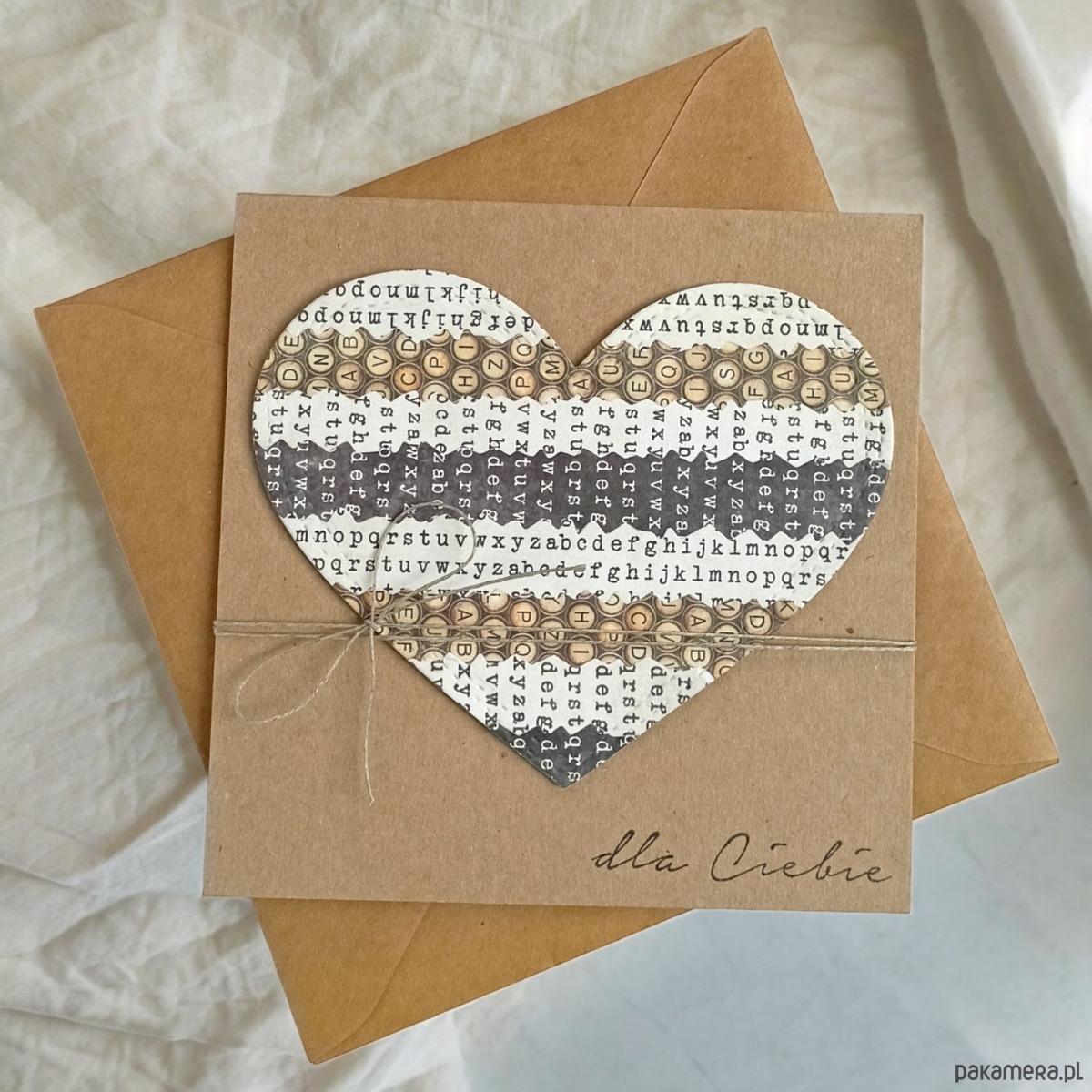 kartka wykonana na bazie bardzo grubego papieru eko-kraft (100% makulatury), napis DLA CIEBIE - stemplowany. przewiązana naturalnym sznurkiem.