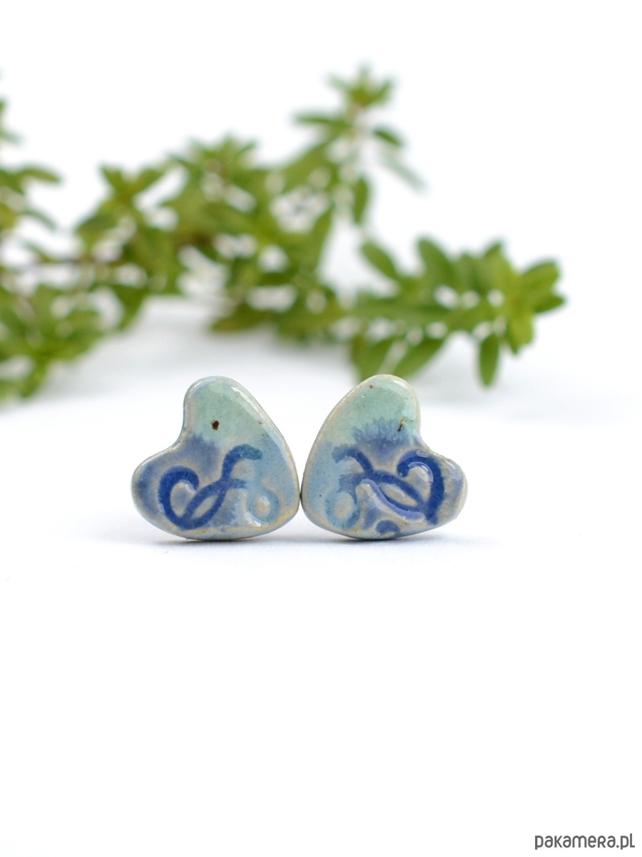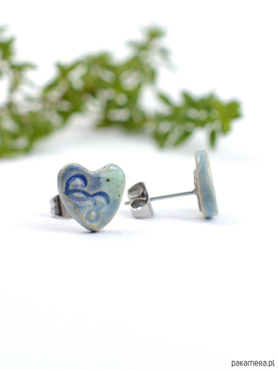 Kolczyki w kształcie serduszek o średnicy 1,1cm i grubości 2mm .Elementy zostały ozdobione motywem zawijasów i poszkliwione w odcieniach niebieskości i mięty. Elementy ceramiczne zostały przeze mnie dopracowane w najmniejszym szczególe :))) Kolczyki są solidnie umocowane na sztyftach ze stali chirurgicznej- antyalergiczna, w kolorze oksydowanego srebra. Wysyłam ozdobnie zapakowane- gotowe na prezent:)