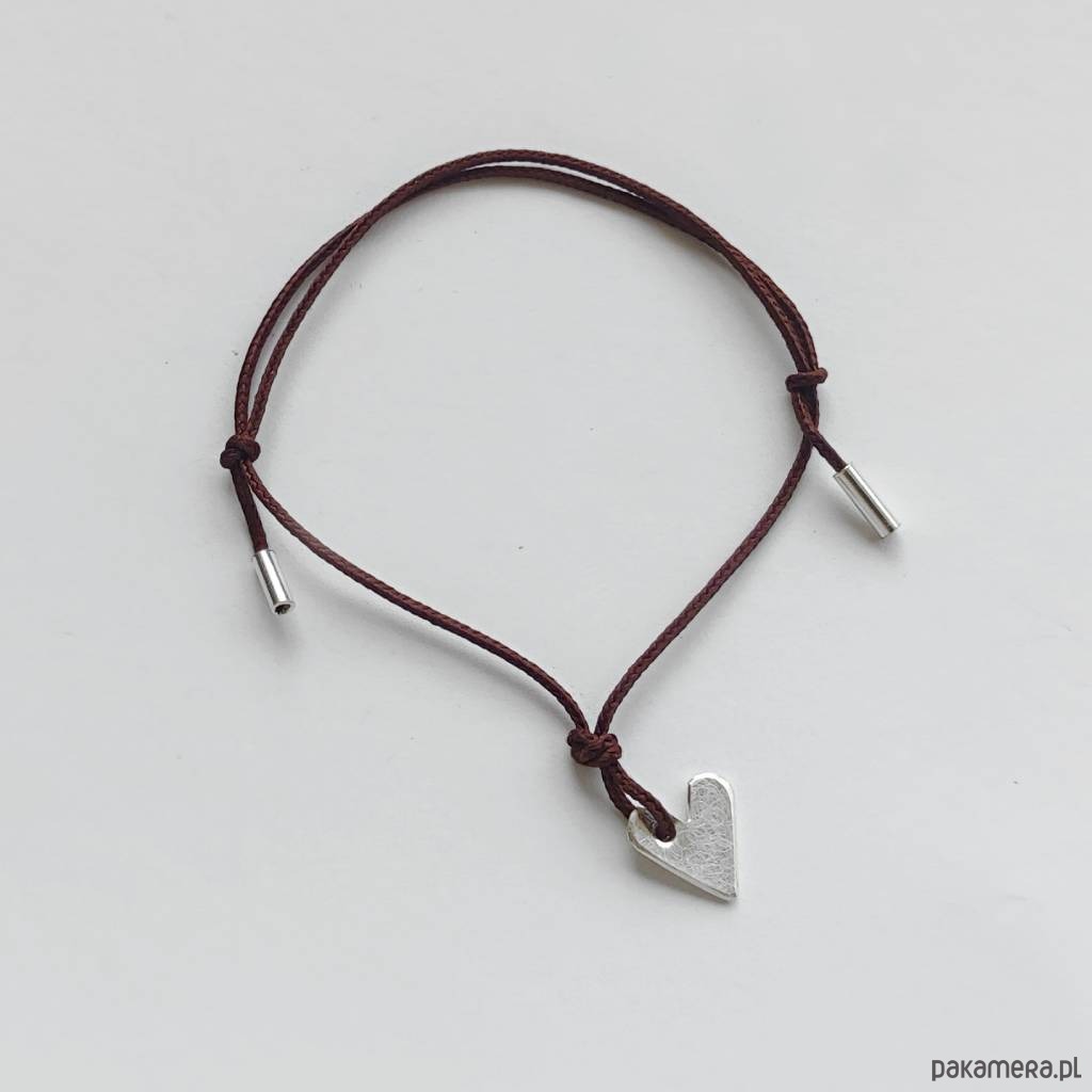 Serduszko bransoletka - uroczy dodatek . Idealna dla kobiet ceniące ładną oraz oryginalna biżuterii. Bransoletka wykonana jest z: srebro, ozdobny sznurek. Srebro - zmatowione. Długość zawieszki - ok 0,8 cm. Szerokość zawieszki - 0,7