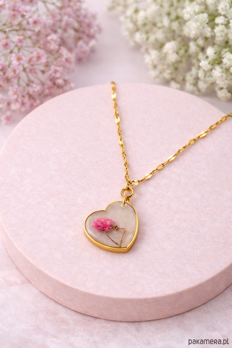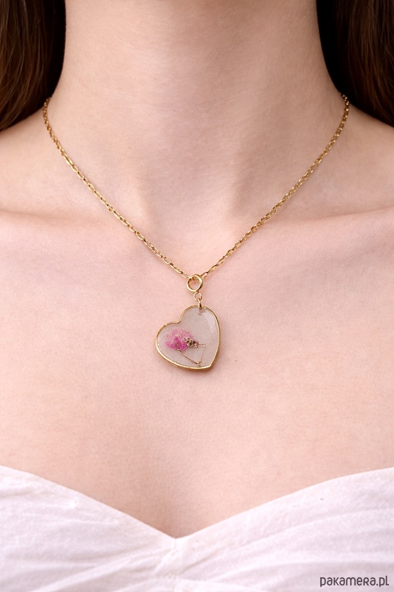 Naszyjnik serduszko z różową gipsówką na jasnym, perłowym tle. Długość łańcuszka 45 cm.