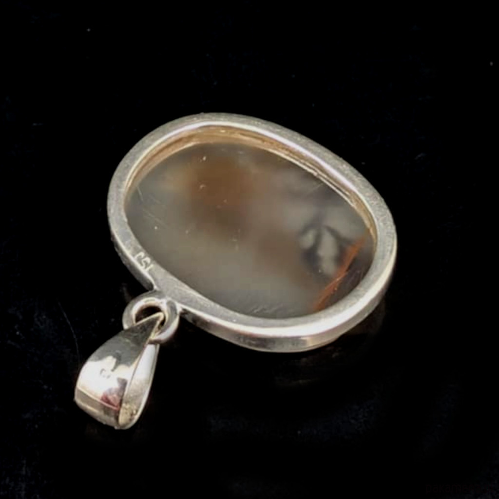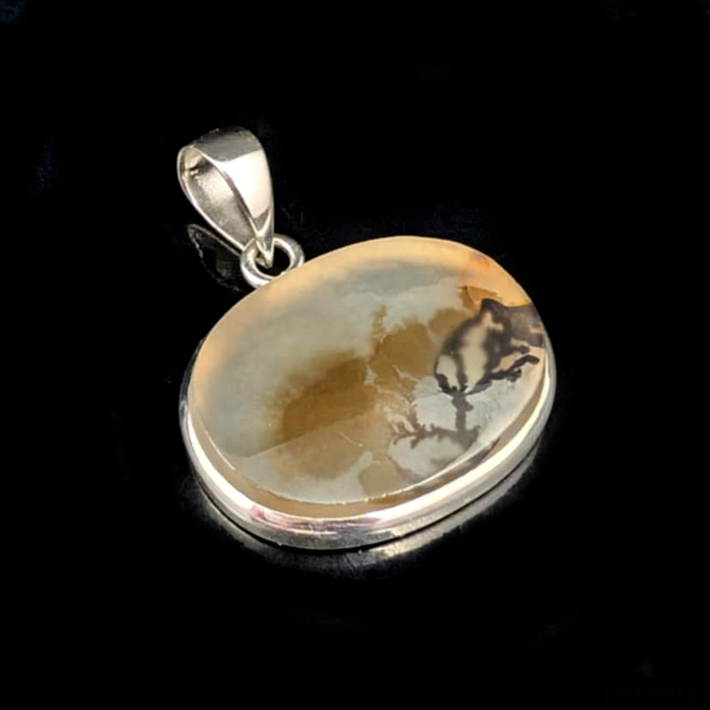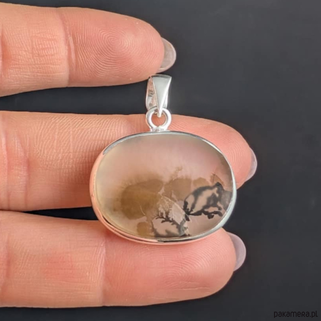 Wisiorek z agatem montana oprawionym w srebro próby 925. Wymiary 26 x 20 mm, długość z krawatką32 mm, waga 6,85 g. Wewnątrz kamienia piękne, naturalne malunki dendrytowe. Tyl wisiora otwarty Wykonany przez dostawcę kamieni.