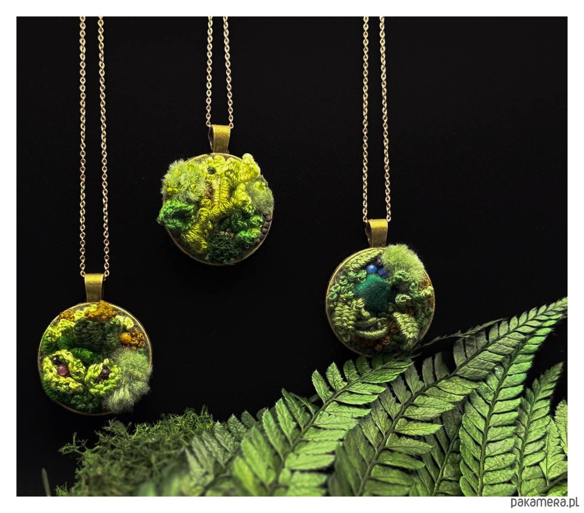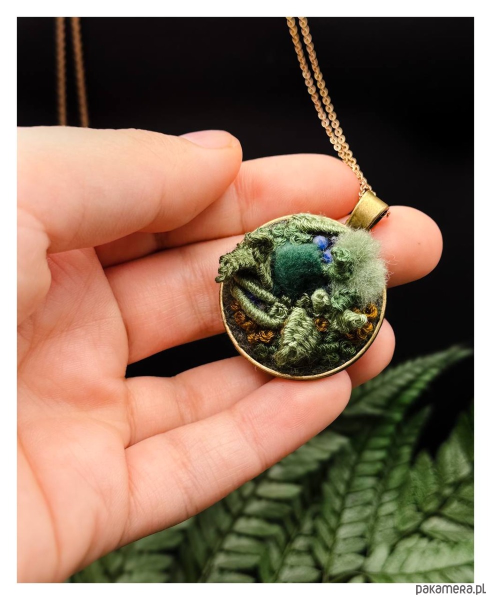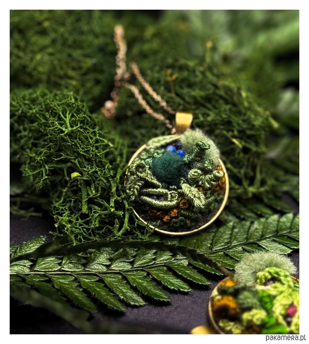 Ręcznie haftowany wisior "Jagodowy zakątek" to coś więcej niż biżuteria – to fragment natury, który możesz mieć zawsze przy sobie. Inspirowany leśnym runem, łączy miękką zieleń mchu z granatowym blaskiem jagód. Tworząc kompozycję pełną harmonii i spokoju. Każdy detal, od faktury haftu po subtelny połysk kamieni, sprawia, że medalion wygląda jak mały ekosystem zamknięty w biżuteryjnej formie.