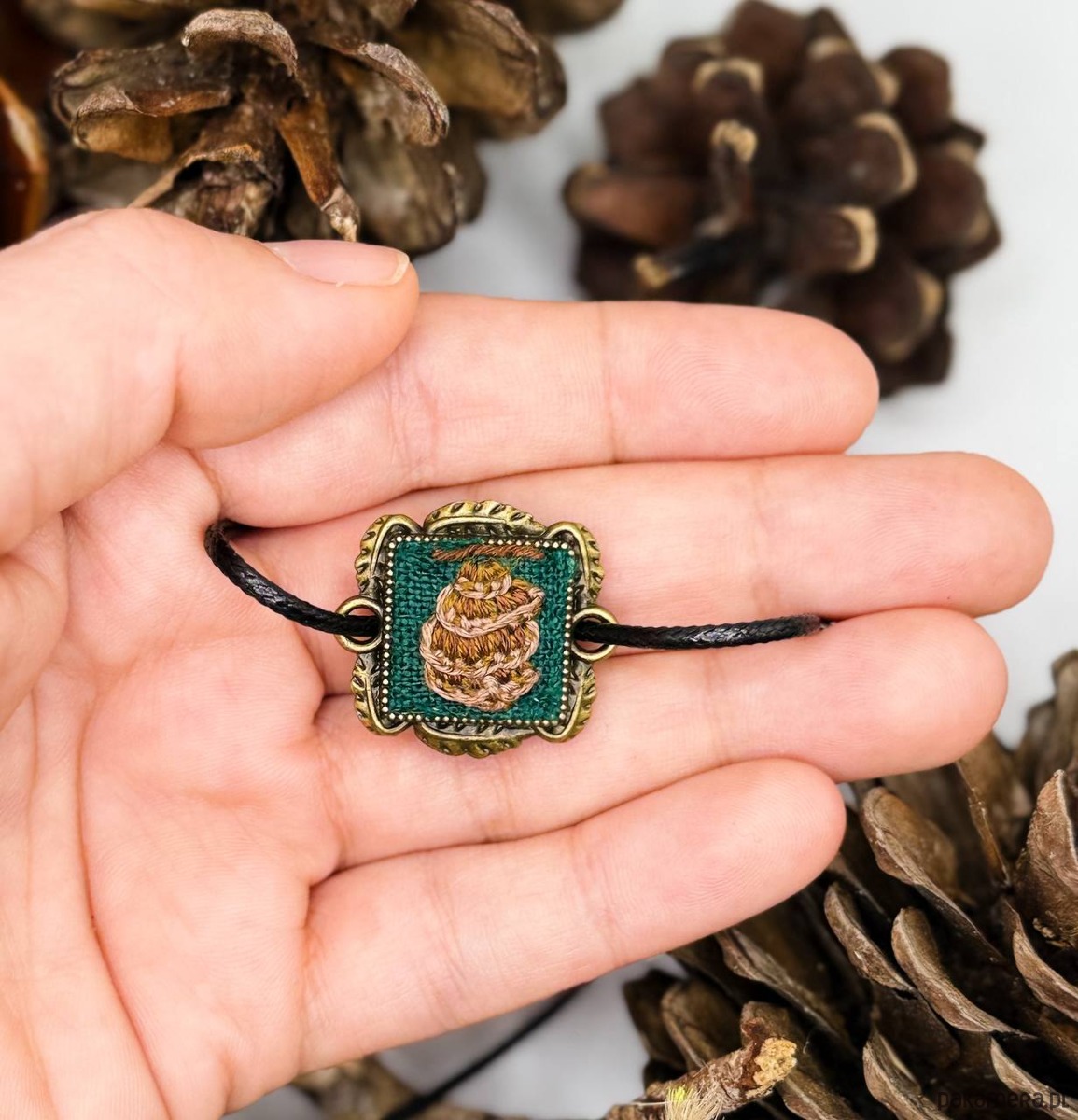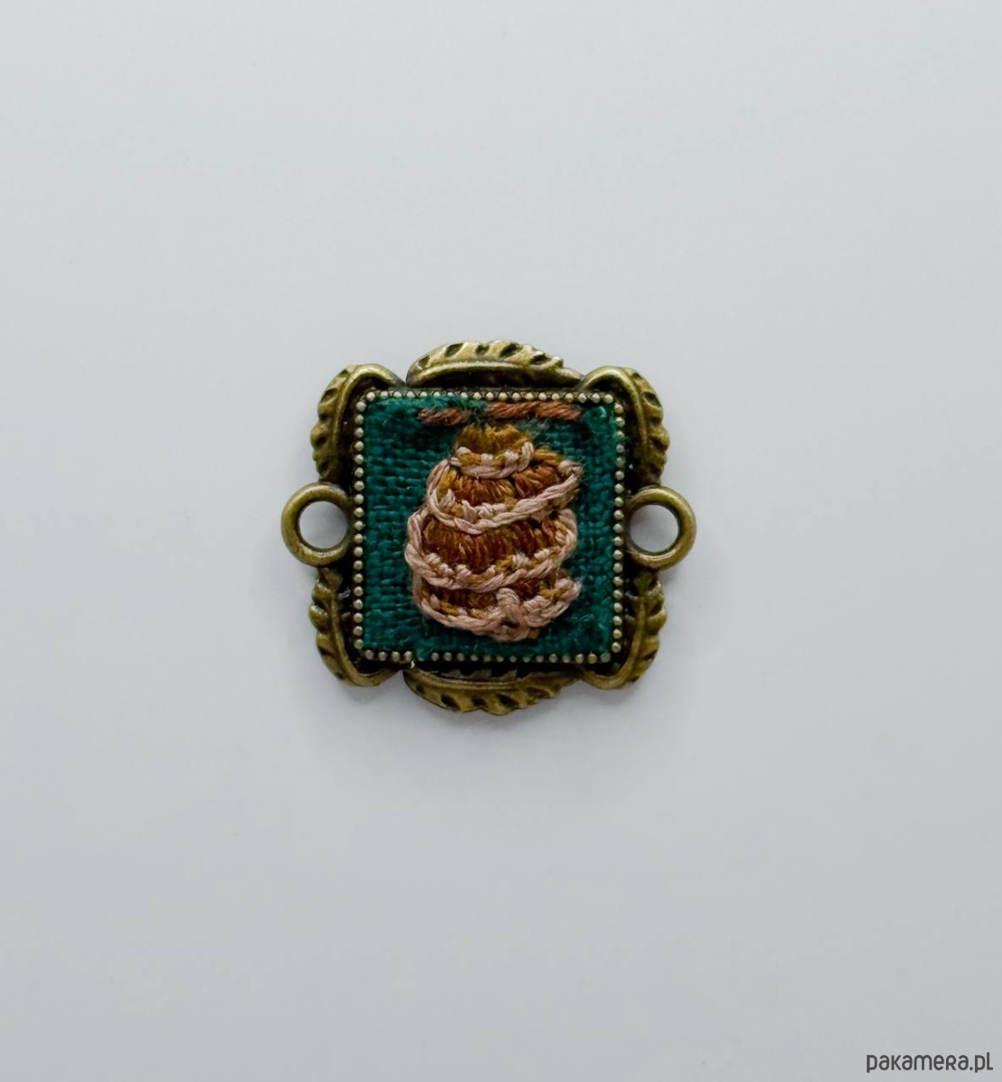 W serii Skarby Lasu każdy z medalionów to hołd dla jesiennej aury. Wyjątkowy haft ręczny zamknięty w metalowej oprawie. Powstały z miłości do natury i detalu, z wykorzystaniem naturalnych tkanin i nici w ciepłych, ziemistych barwach. Inspiracją były szyszki i leśne skarby - symbole spokoju, cyklu życia i zakorzenienia.