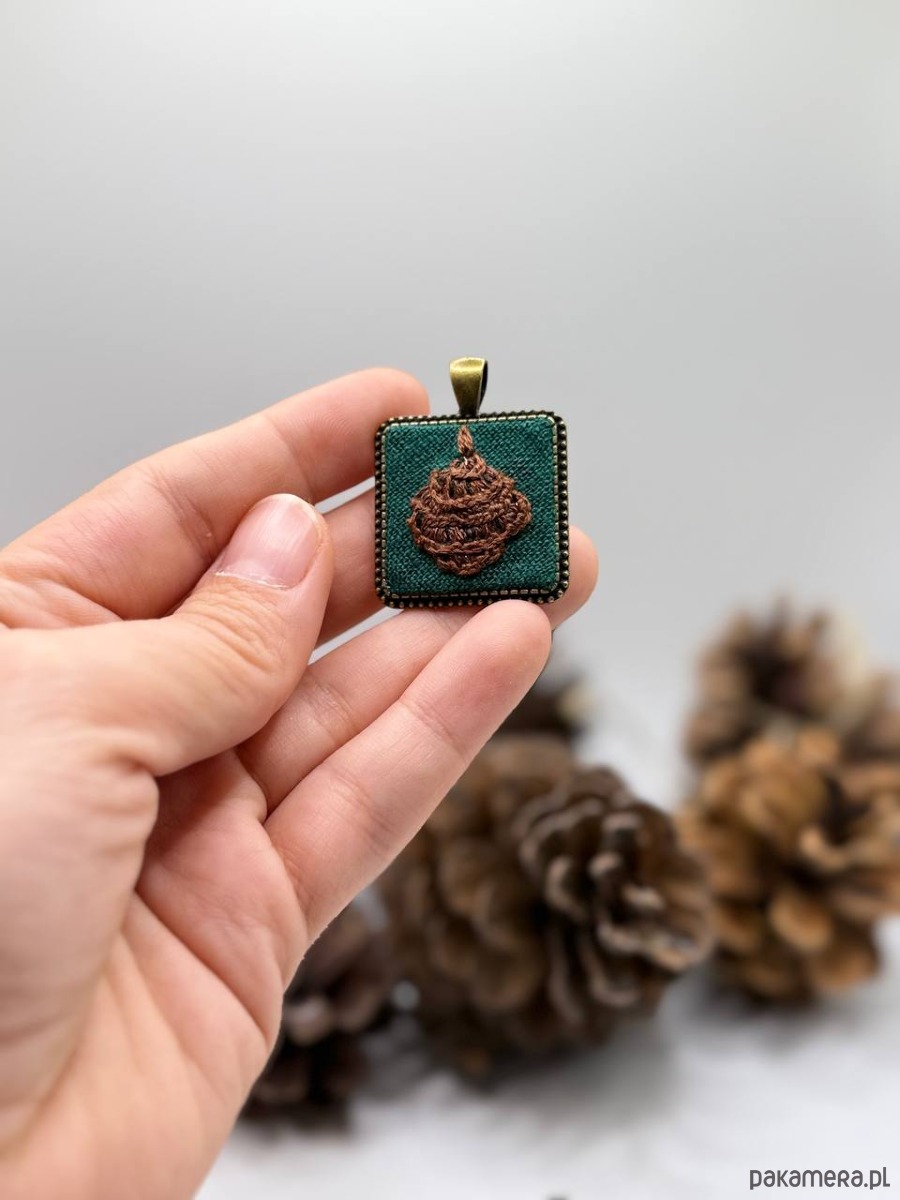 W serii Skarby Lasu każdy z medalionów to hołd dla jesiennej aury. Wyjątkowy haft ręczny zamknięty w metalowej oprawie. Powstały z miłości do natury i detalu, z wykorzystaniem naturalnych tkanin i nici w ciepłych, ziemistych barwach. Inspiracją były szyszki i leśne skarby - symbole spokoju, cyklu życia i zakorzenienia.