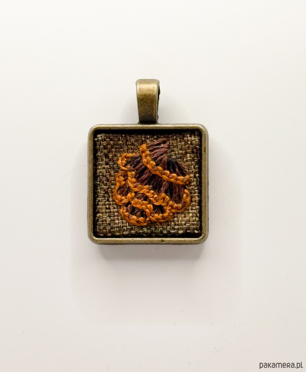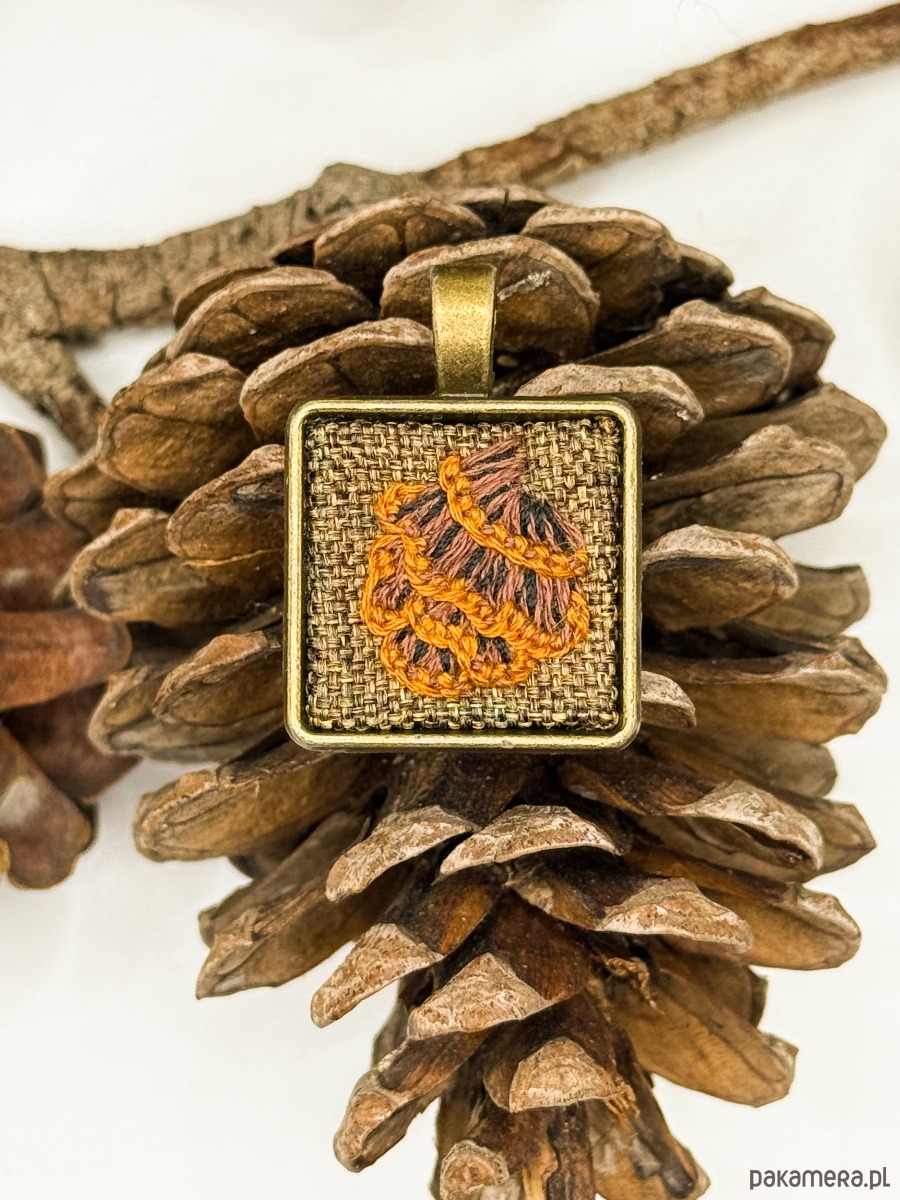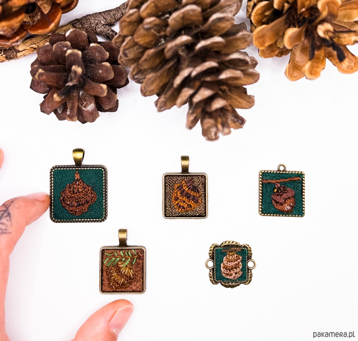 W serii Skarby Lasu każdy z medalionów to hołd dla jesiennej aury. Wyjątkowy haft ręczny zamknięty w metalowej oprawie. Powstały z miłości do natury i detalu, z wykorzystaniem naturalnych tkanin i nici w ciepłych, ziemistych barwach. Inspiracją były szyszki i leśne skarby - symbole spokoju, cyklu życia i zakorzenienia.