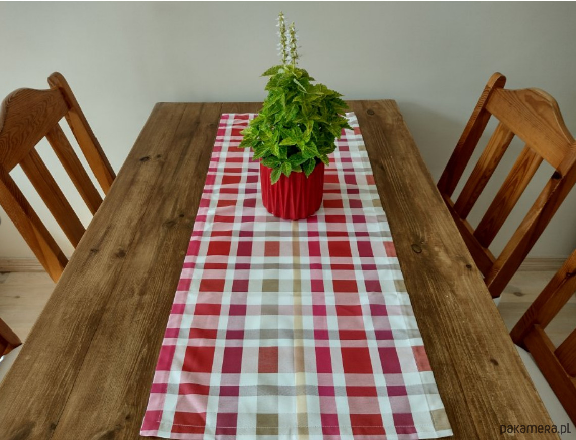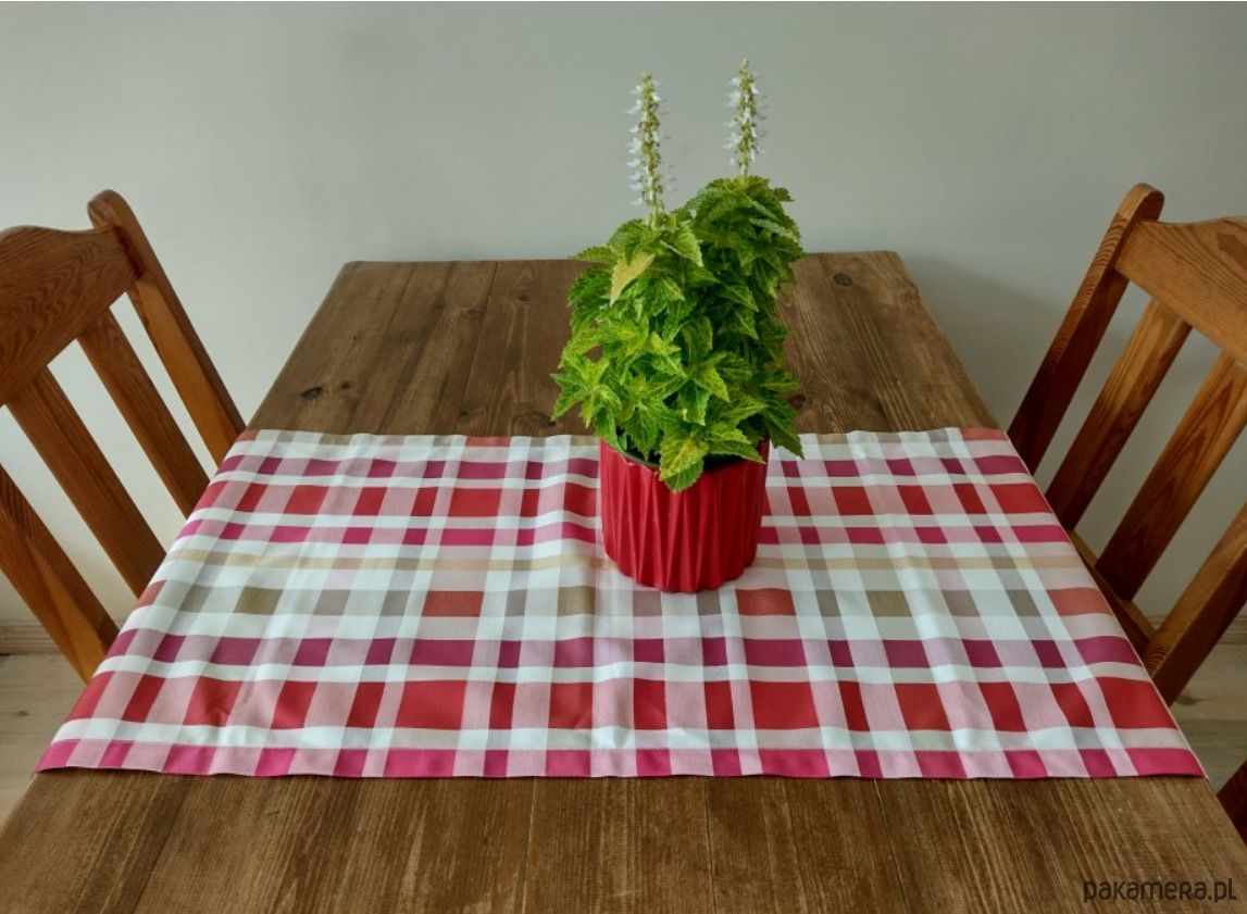 Serweta, mały obrus, bieżnik na stół. Wzór krata w kolorze: czerwony, różowy, biały, beżowy, pomarańczowy. Wymiary: 97 cm x 40 cm. Uszyty z materiału o widocznym splocie. Wiskoza, poliester.