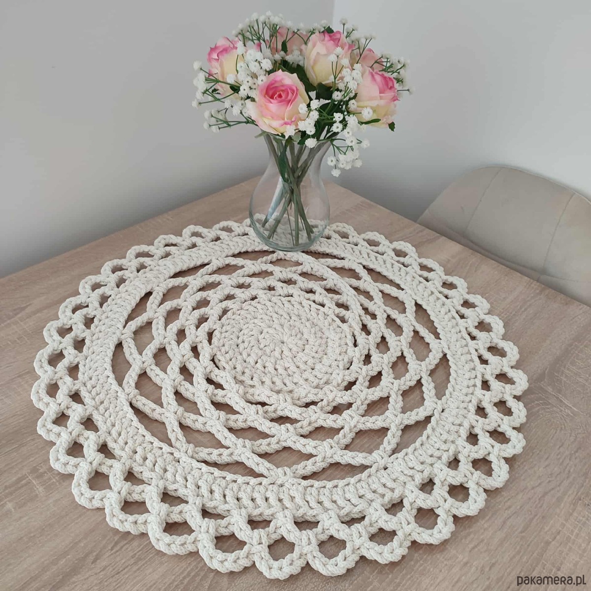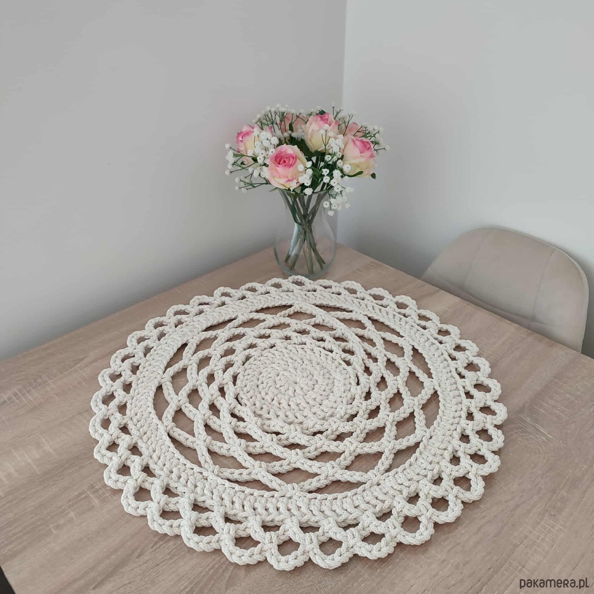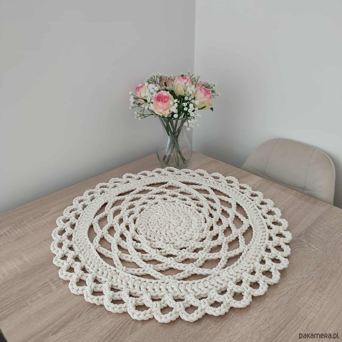 Serweta o średnicy 60cm, wykonana metodą szydełkowania z polskiego sznurka bawełnianego 5mm.