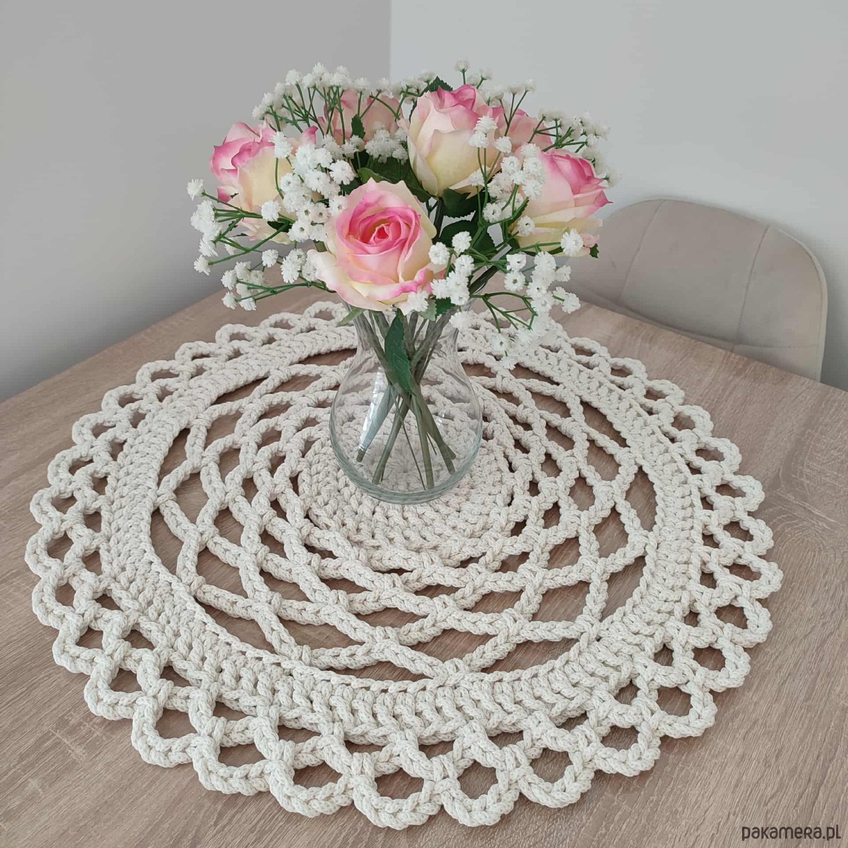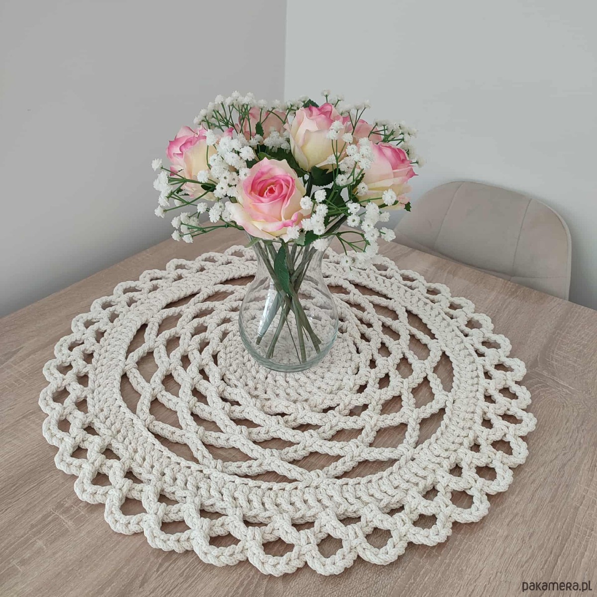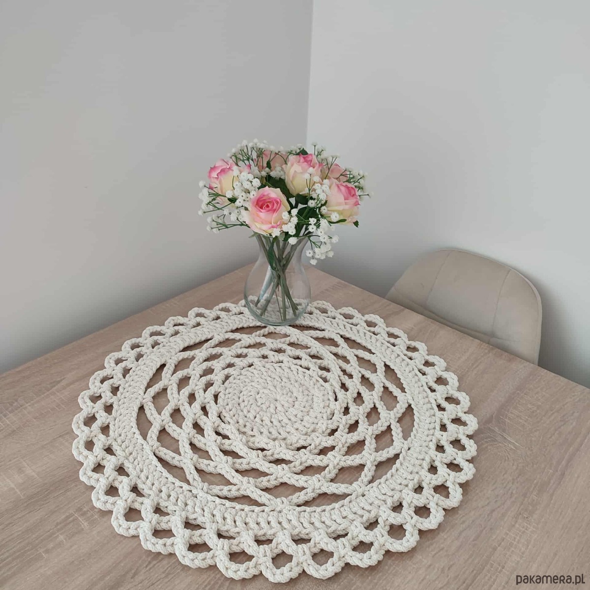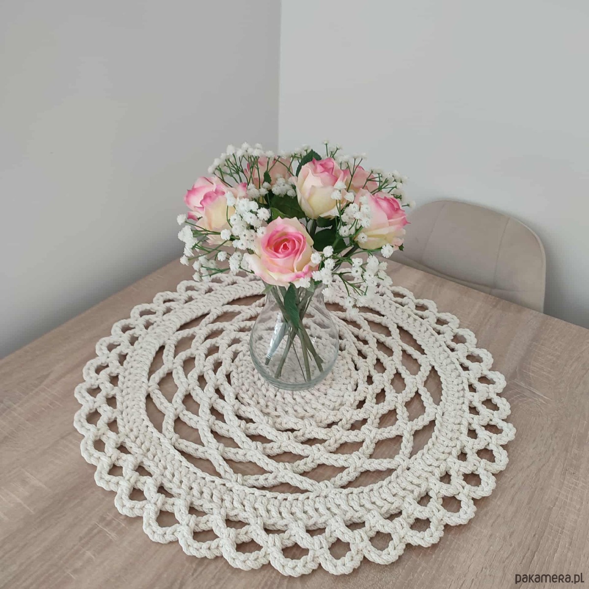 Serweta o średnicy 60cm, wykonana metodą szydełkowania z polskiego sznurka bawełnianego 5mm.