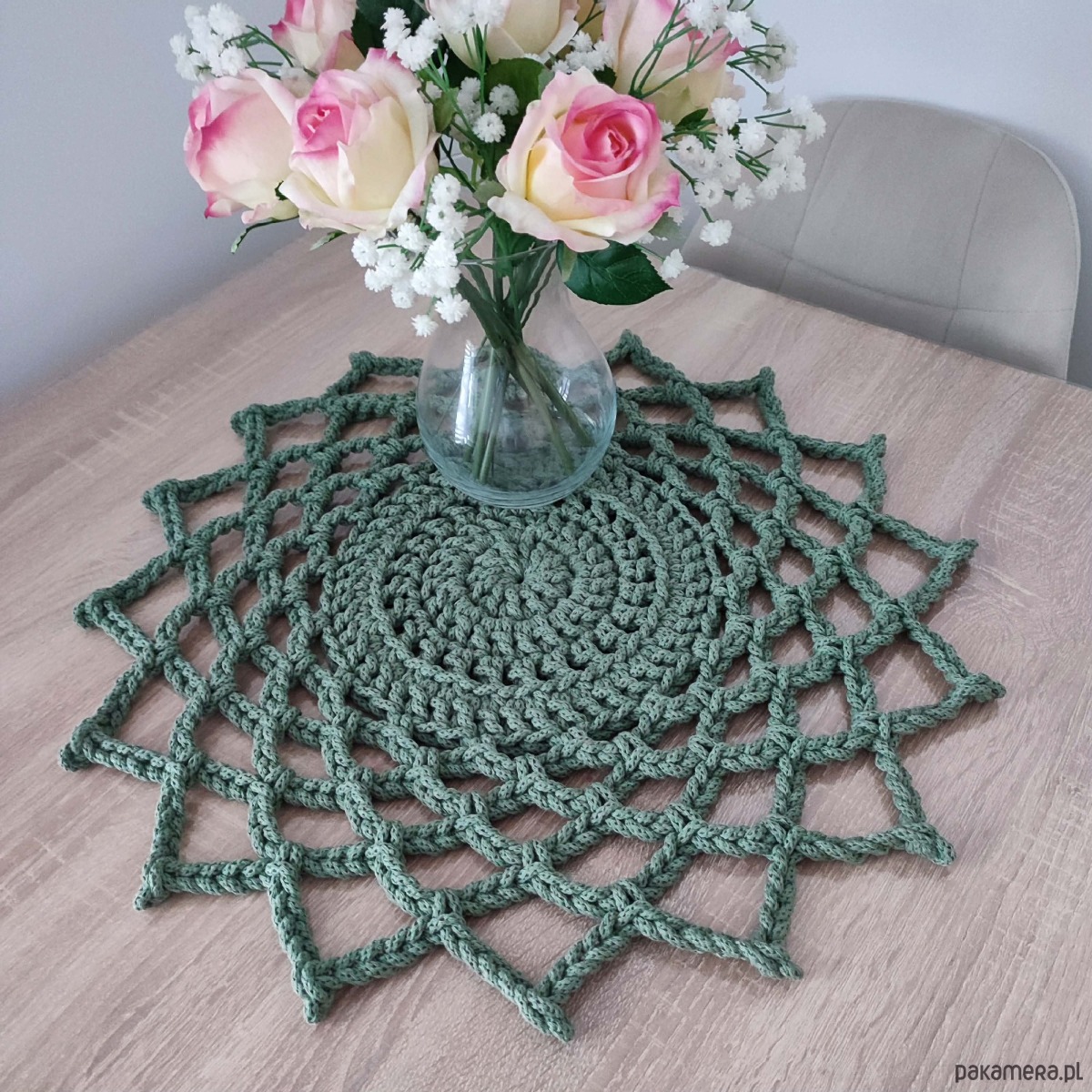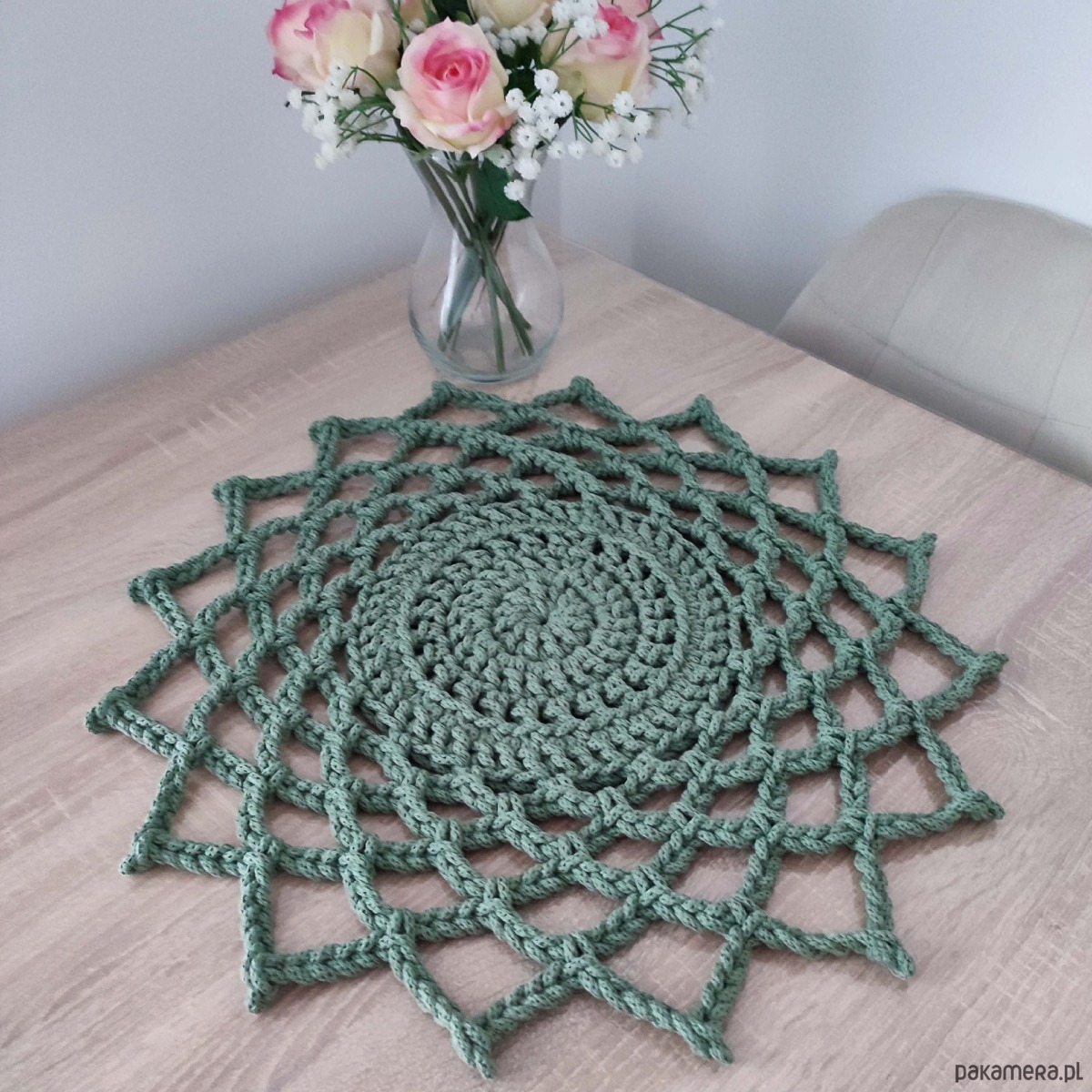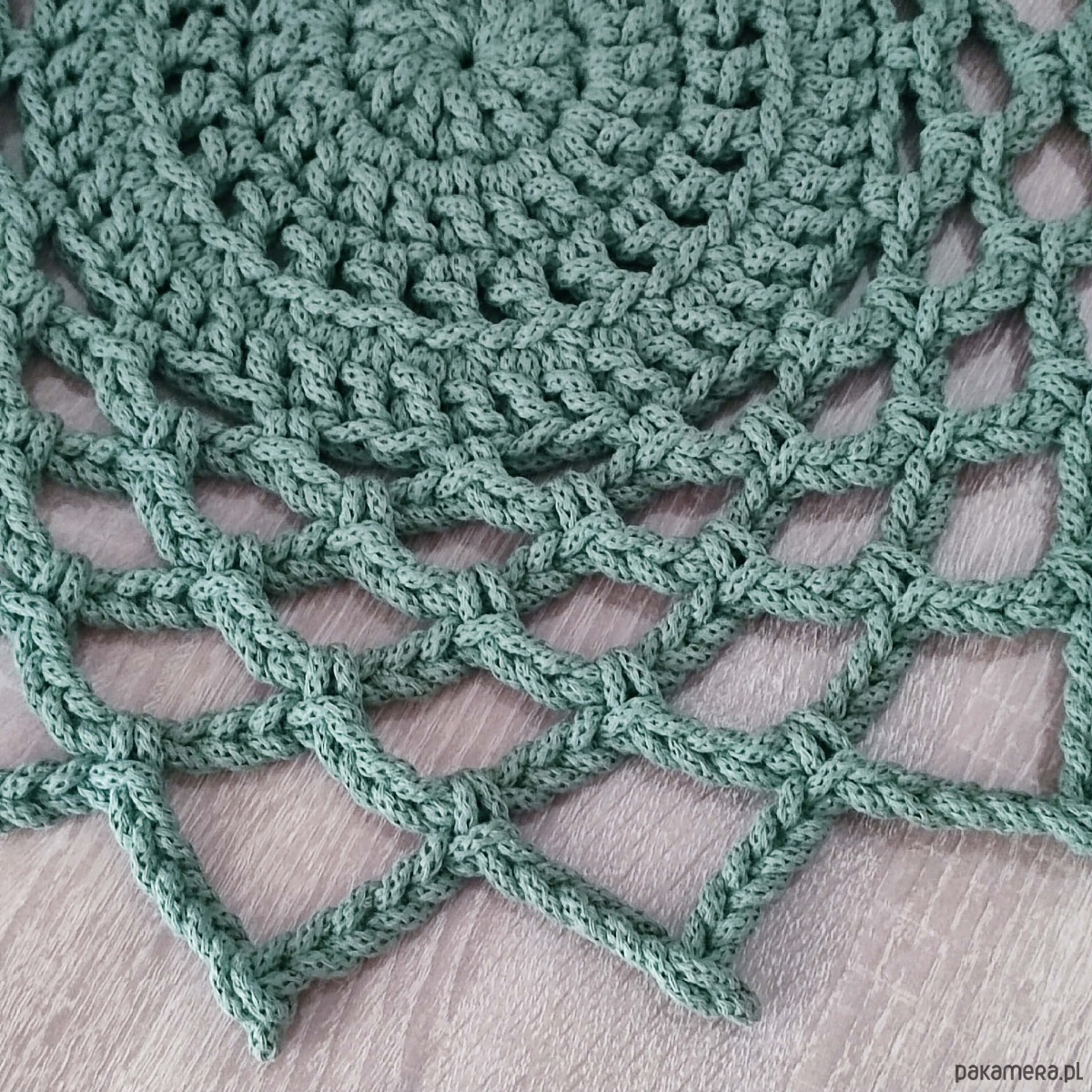 Serweta o średnicy 50cm, wykonana metodą szydełkowania z polskiego sznurka bawełnianego 5mm.