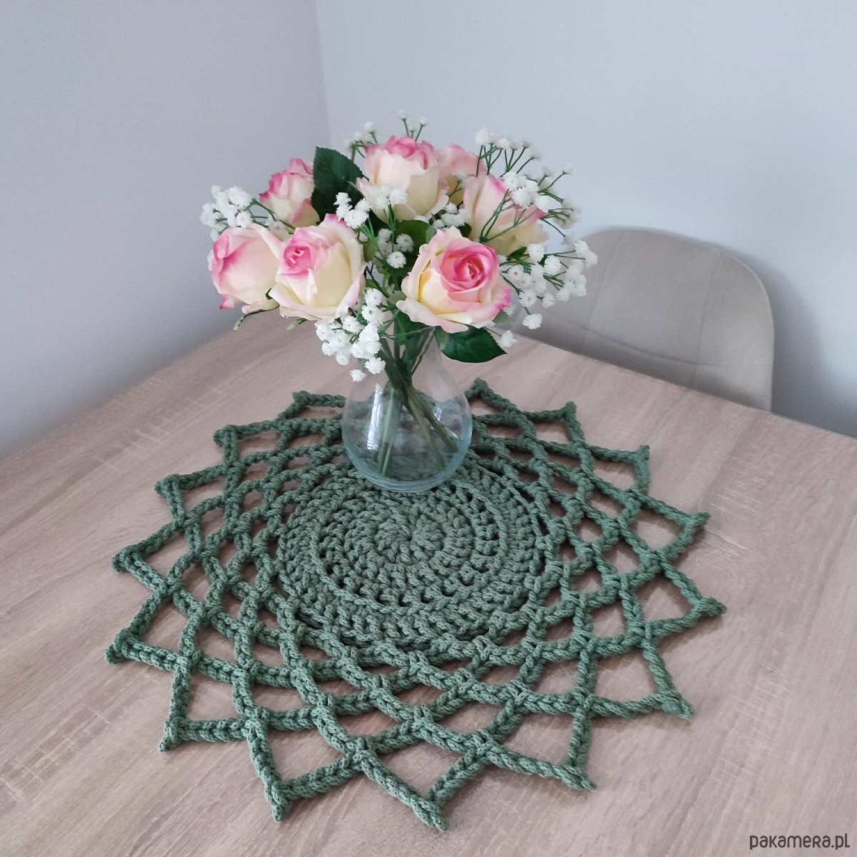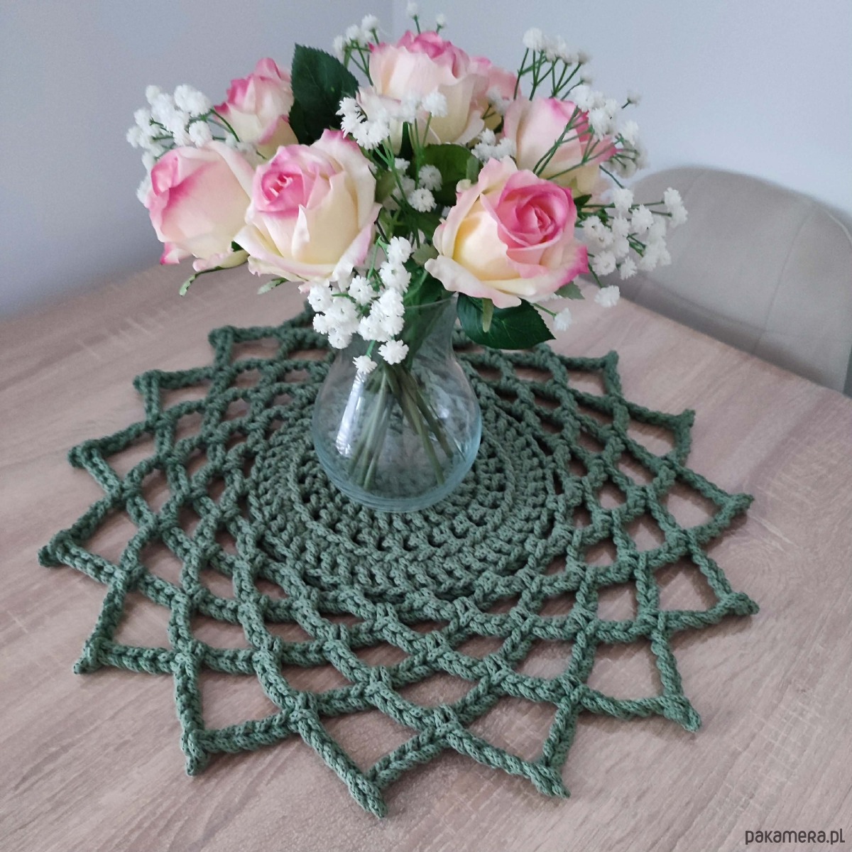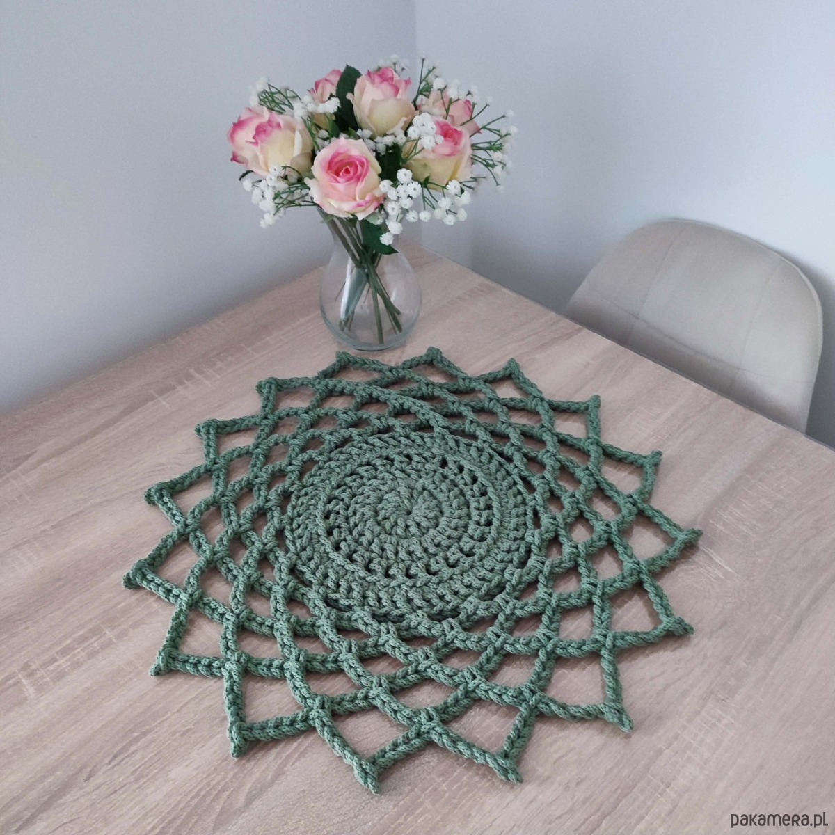 Serweta o średnicy 50cm, wykonana metodą szydełkowania z polskiego sznurka bawełnianego 5mm.